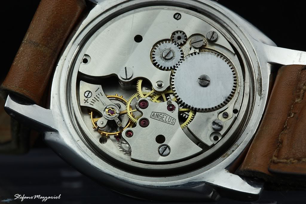 Angelus produced in 1955 and 1961 a series of non-alarm crown-wind movements with 17 Jewels specifically developed for the use in wrist watches on special request of Guido Panerai e Figlio. These movements were assembled using old non-alarm barrel plates recognizable by the old “waved” design. In order to take the long-click these old plates had to be slightly modified.