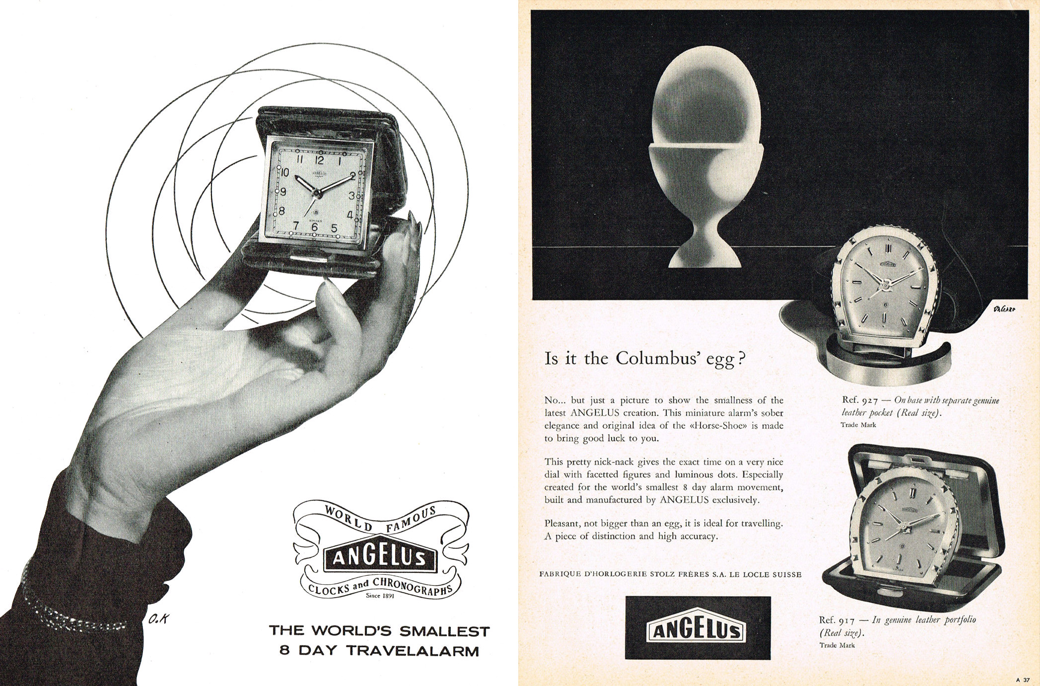 The Angelus 240 movement was introduced by Stolz Frères in Le Locle as the world’s smallest 8-day alarm watch movement in 1936 . It was build as pillar caliber and was working on the hundredth millionth part of ONE horsepower.