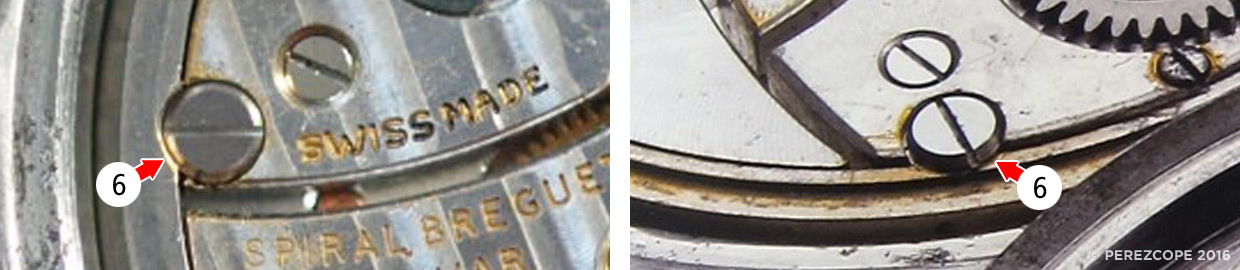 6) The movement retaining ring of the watch in question has been altered in order to fix the thinner movement. The recess in the retaining ring is irregular, and looks gouged, like someone filed it to get the screw to fit. The casing screws in original watches sit on top of the movement ring and are not recessed.