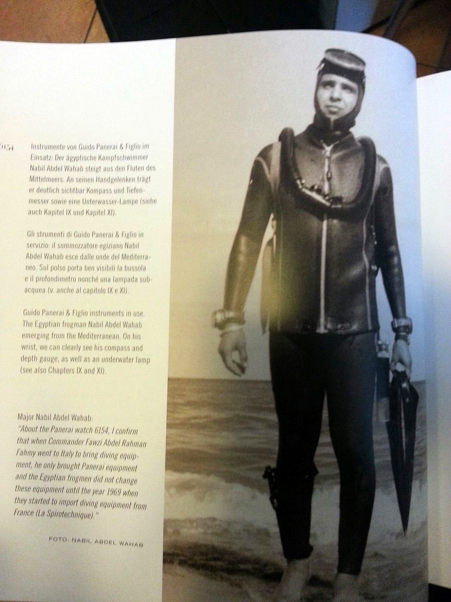 There is also a picture of the former Egyptian frogman and major Nabil Abdel Wahab equipped with Panerai instruments such as compass and depth gauge. He also carries an underwater lamp. The watch on his wrist is not mentioned at all, obviously because it is not a 6154.
