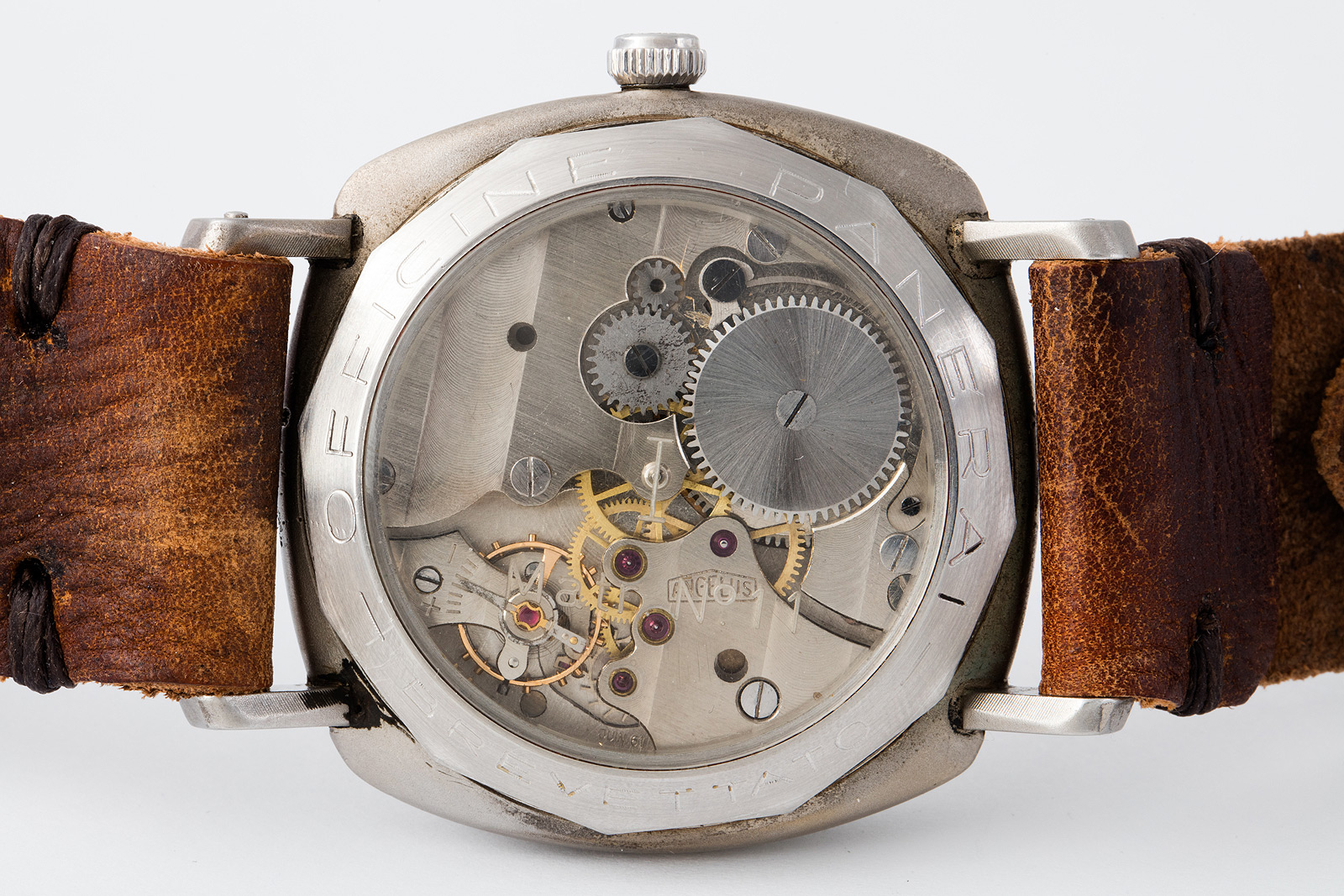 According to a ComSubIn inventory list from 1988, the present watch was listed as having a ‘Marina Militare’ dial. That list came to my attention only in February 2017. Since this article was written, another two previously unknown examples have surfaced, given us a better picture as to what these watches looked like. Today, four pieces are known to exist in total (plus a handful of Rinaldi counterfeits, e.g. ‘Matr. No. 17’ and ‘Matr. No. 21’). One is part of the Panerai heritage collection and was handed over to Vendôme/Richemont when the original Panerai company from Florence sold their name to the luxury conglomerate in March 1997. That watch features a ‘Marina Militare Luminor Panerai’ 4-liner dial and does not have any markings on the display caseback. Another example surfaced in June 2016 featuring a ‘Marine Militare Officine Panerai’ 4-liner dial and ‘Matr. No. 2’ engravings. Two years ago, ‘Matr. No. 5’ surfaced from a private Italian collection featuring a 2-liner ‘Marina Militare’ dial. All pieces except for the present watch are equipped with Angelus 240 calibers featuring the date stamp ‘12.55’ (December 1955) and a brushed finish. It is unknown why this watch is now equipped with a ‘Luminor Panerai’ dial and features a later movement marked ‘JUIN.61’ (June 1961).