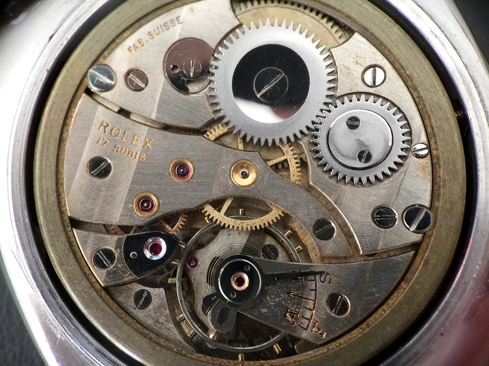 The movement of this watch is the correct Rolex 618 Type 1b (straight Rolex engravings). The bridges appear to have been cleaned at some point since the red filling color of the engravings is gone. The “gold” color is actually the brass material. The engravings were usually applied after the bridges had been plated.