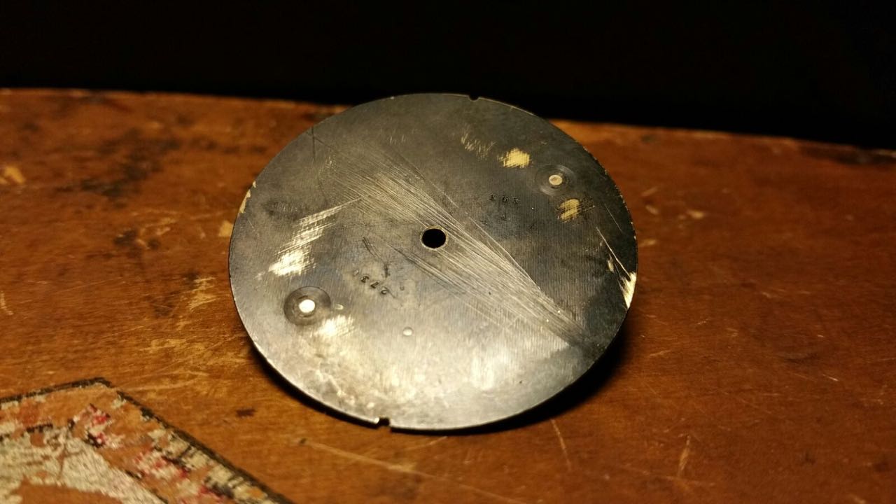 Dials with removed feet (103 * 2731) had the feet originally soldered in a pocket watch configuration. This is a very important fact. Those dials would have looked like this when installed in a watch.