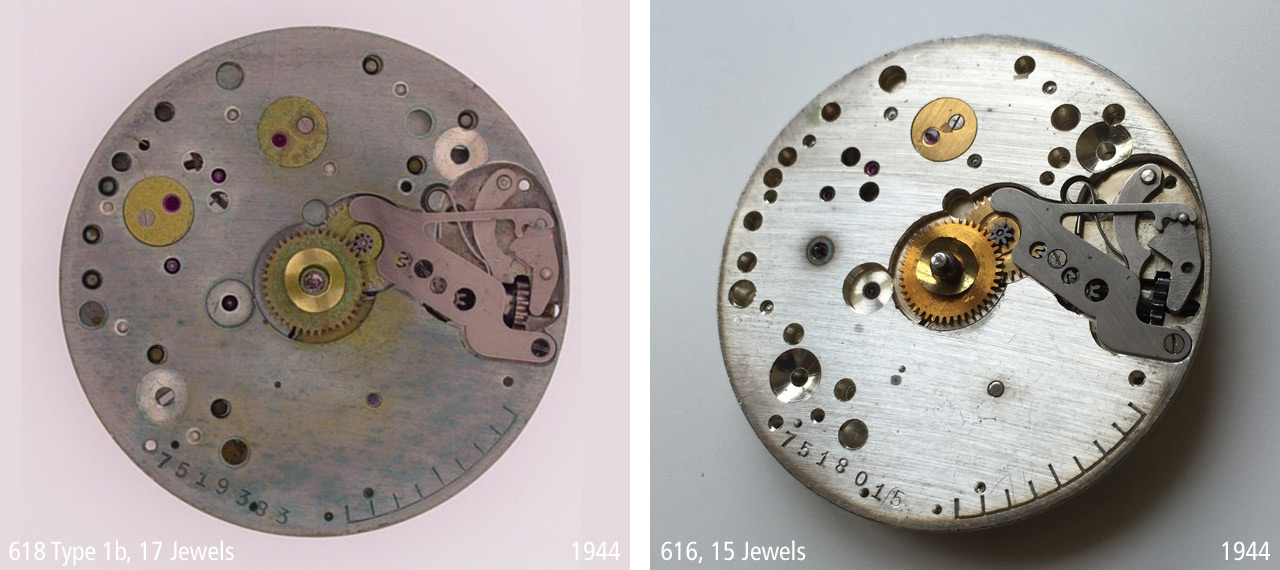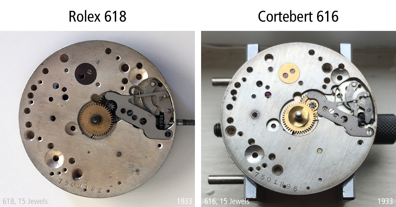 The next pictures shows the dial side of a Rolex 618 Type 4 compared to a historically corresponding Cortebert 616. These movement have neither a serial number nor a test track.
