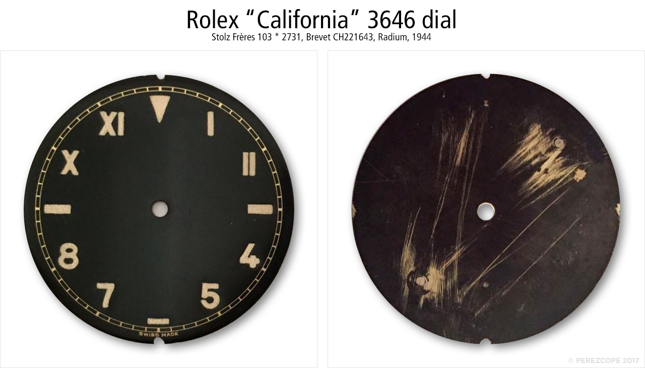 However, if we compare the back of California dials with removed dial feet and those with intact feet, we can see the feet were not soldered at the same place. They also have different reference numbers: 103 * 2731 vs. 103 * 2802.
