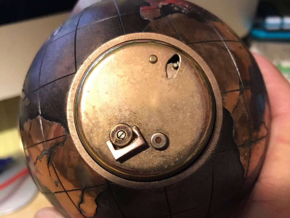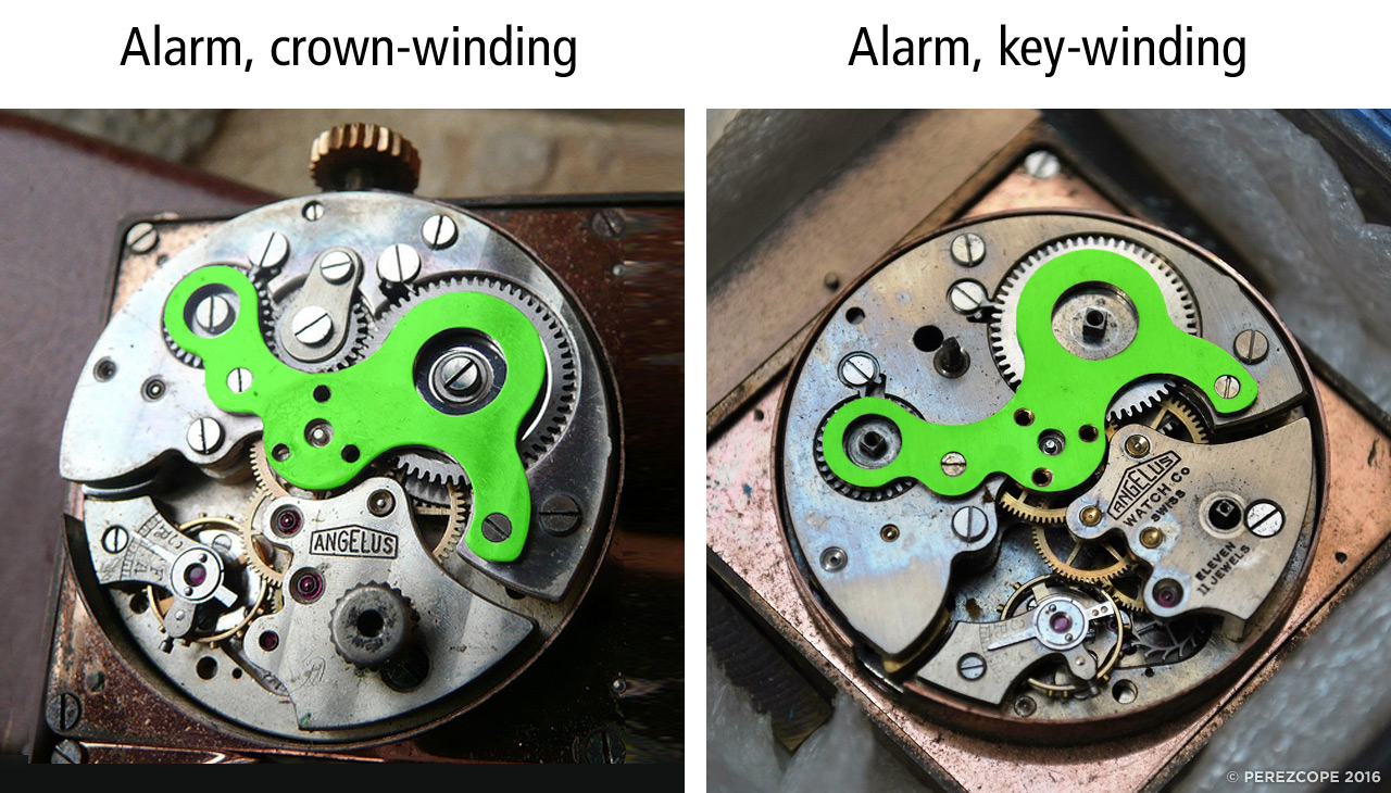However, in decorative table clocks, where the units were integrated in globes etc., a protruding crown would have been disturbing anyway. These applications were exclusively equipped with less complicated non-alarm, key-winding Angelus 240 movements.