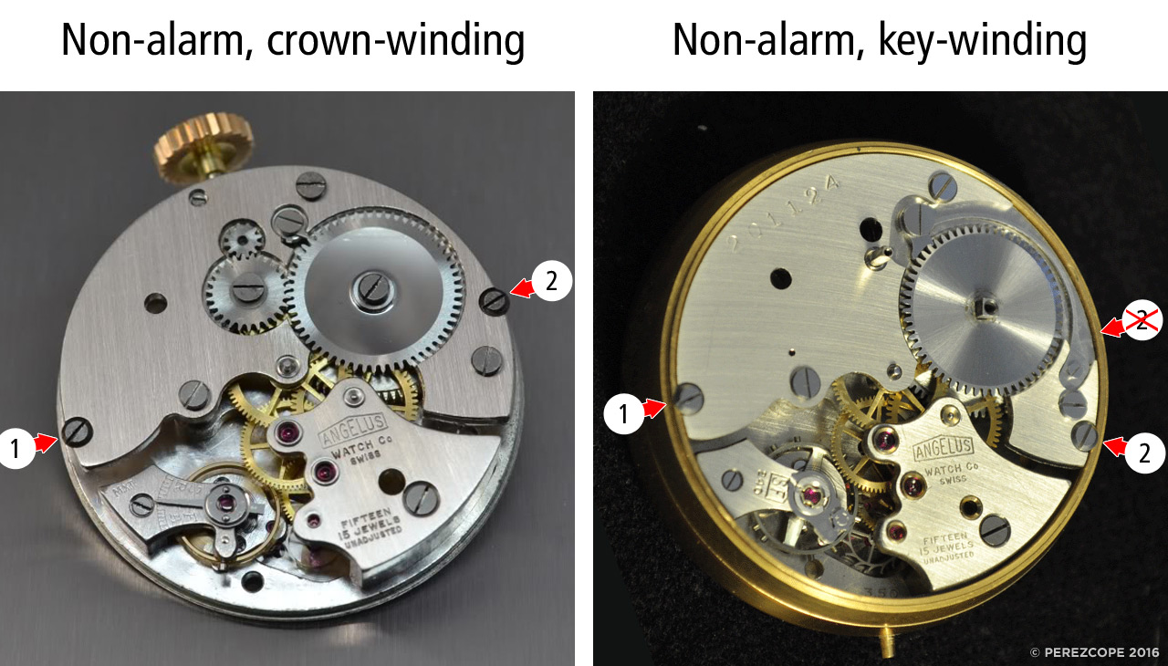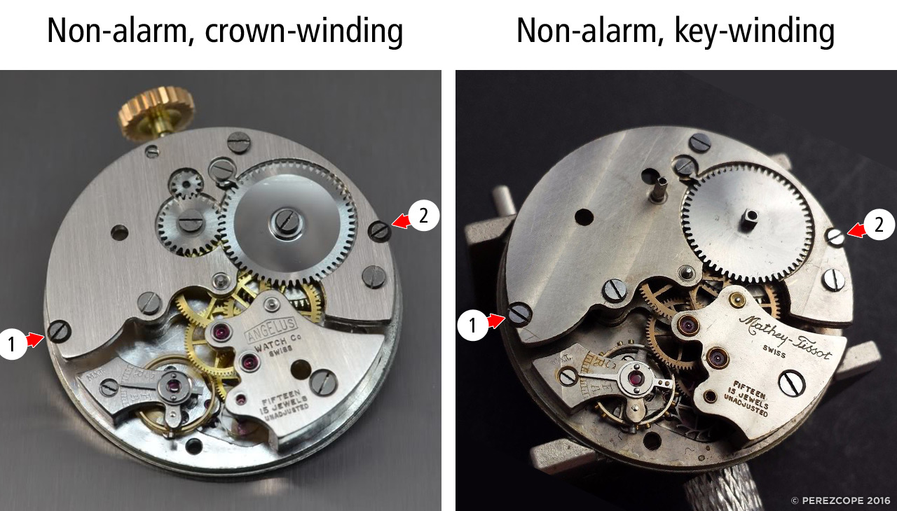 Non-alarm movements used common casing screws (1, 2) through holes which are positioned 180 degrees from each other at the edge of the barrel bridge.