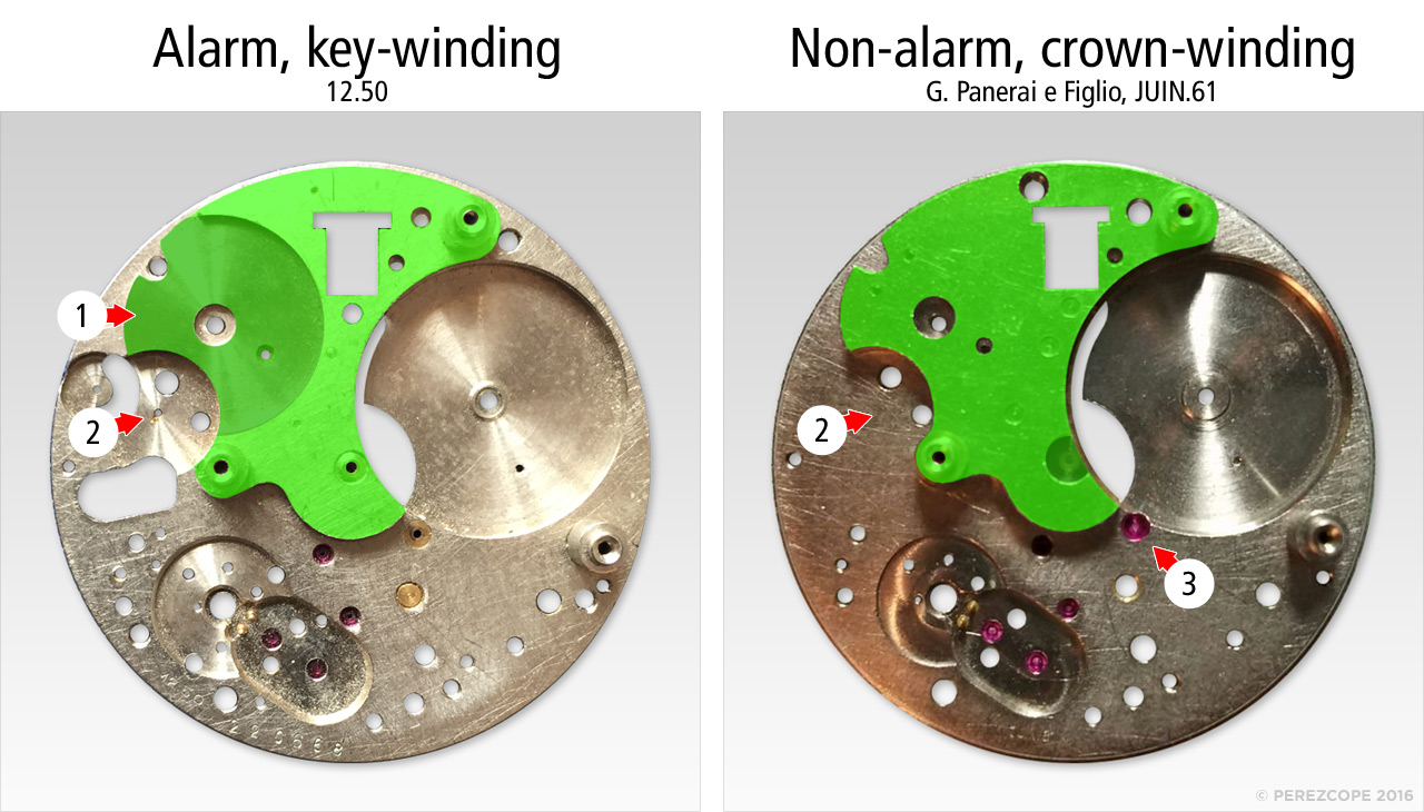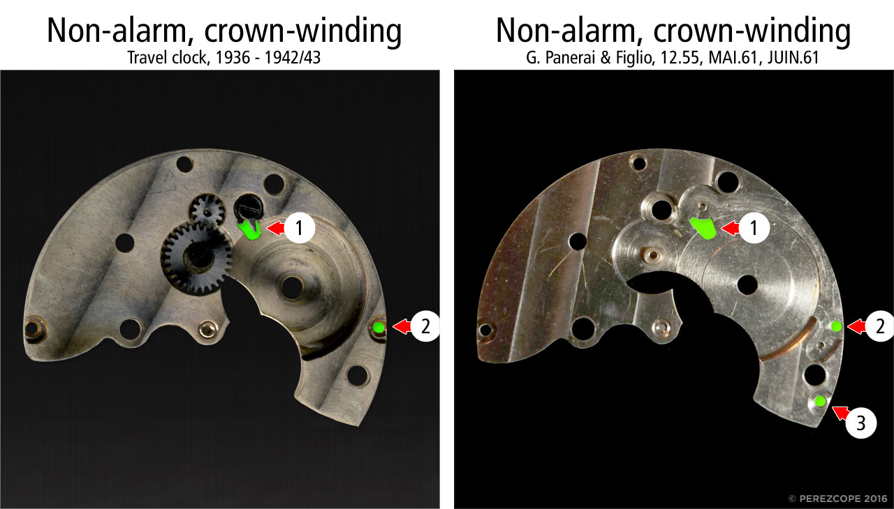 This comparison shows that the intermediate bridges have the same basic shape in all configurations. On alarm movements the bridge has a recess to fit the alarm barrel (1). Main plates of alarm movements have more holes and slots. The recess underneath the alarm barrel (2) is meant for the alarm hammer mechanism. Clearly visible is also the extra jewel (3) in the main plate of the original “Panerai” Angelus. The other added jewel is in the train gear bridge.