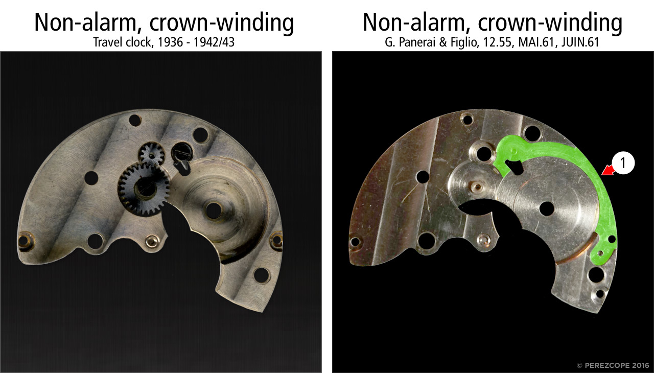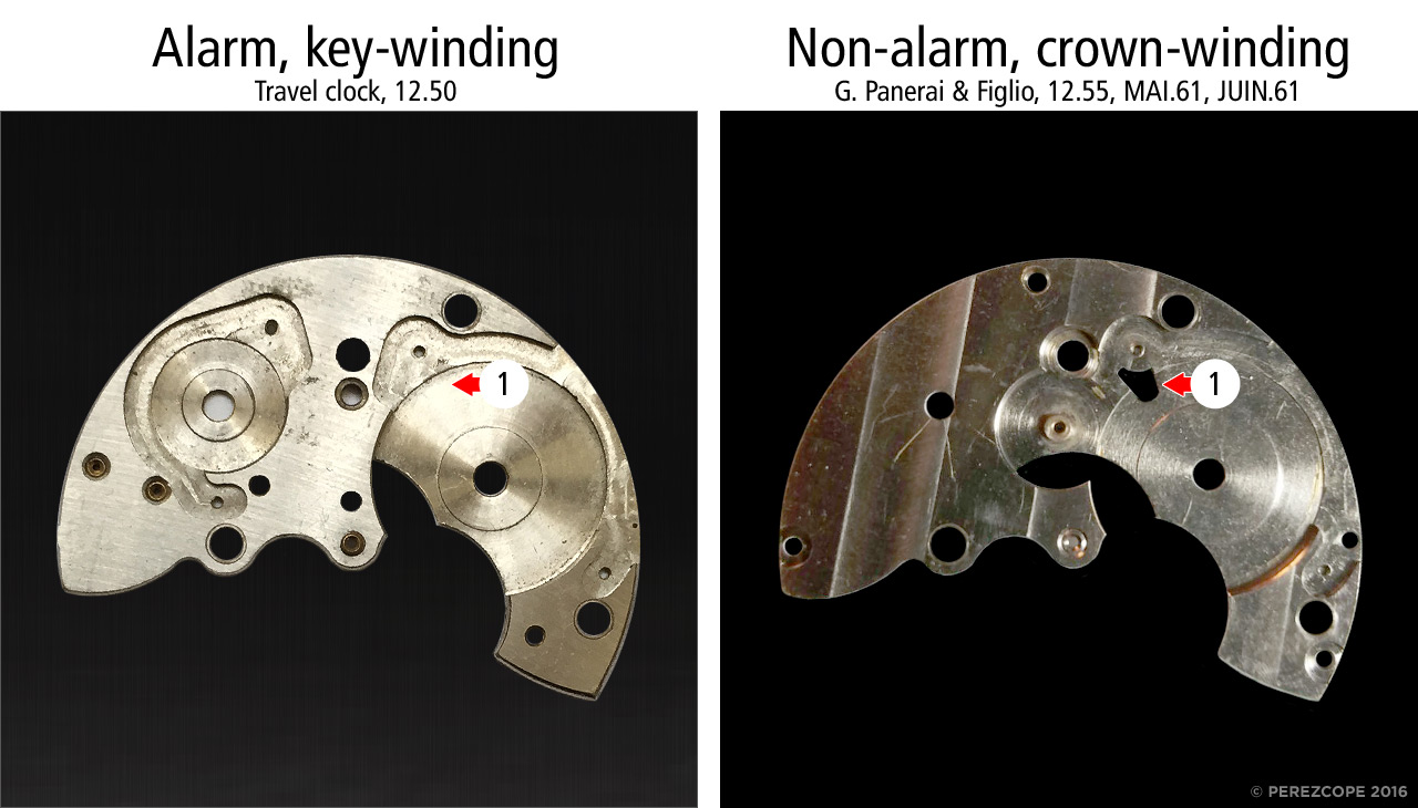 A side by side comparison of the original “Panerai” barrel bridge (right, JUIN.61) with an alarm, key-winding barrel bridge from 12.50 (December 1950) shows that the new long click spring did not require the deep slot (1) anymore.