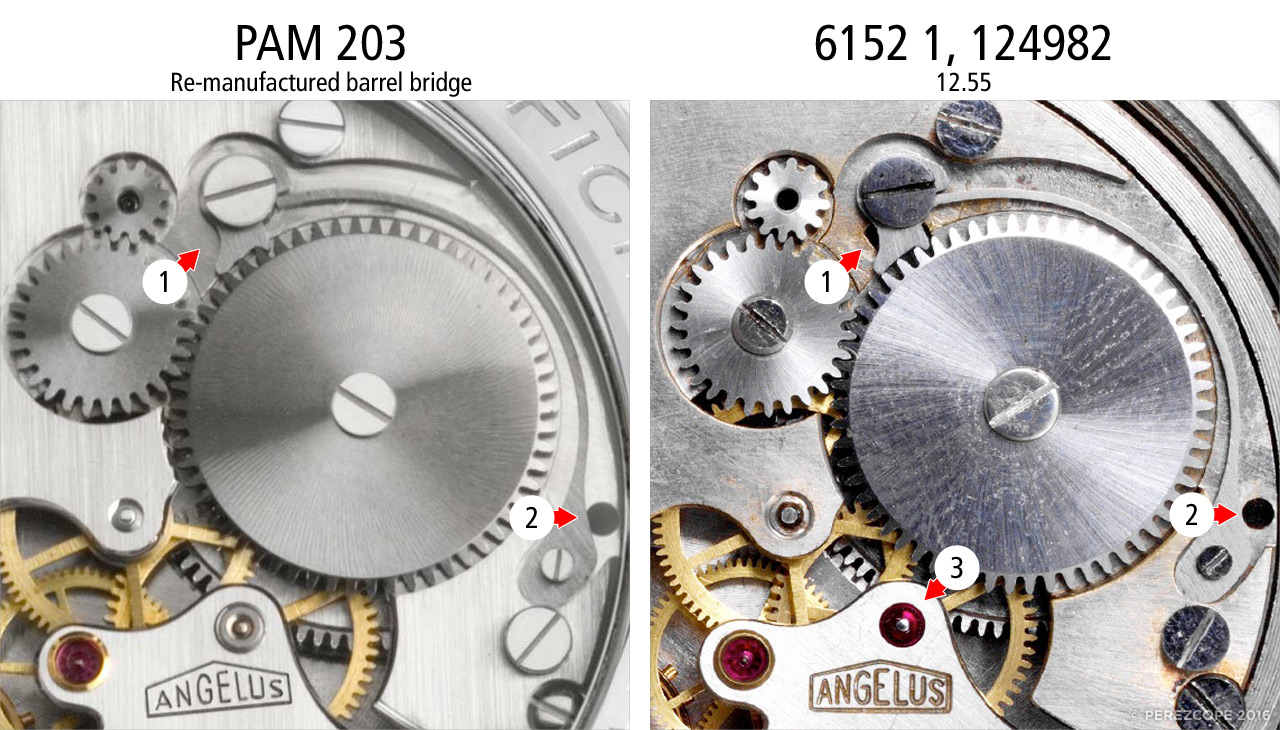 It is difficult to say what other parts were re-manufactured. All PAM 203 main plates I have seen so far appear to be from non-alarm movements (less holes). This could be an indication that the original key-winding movements were without alarm function. Richemont “removed” all visible date stamps and other marks with the extensive refinishing. This makes it difficult to asses the rest of the parts.