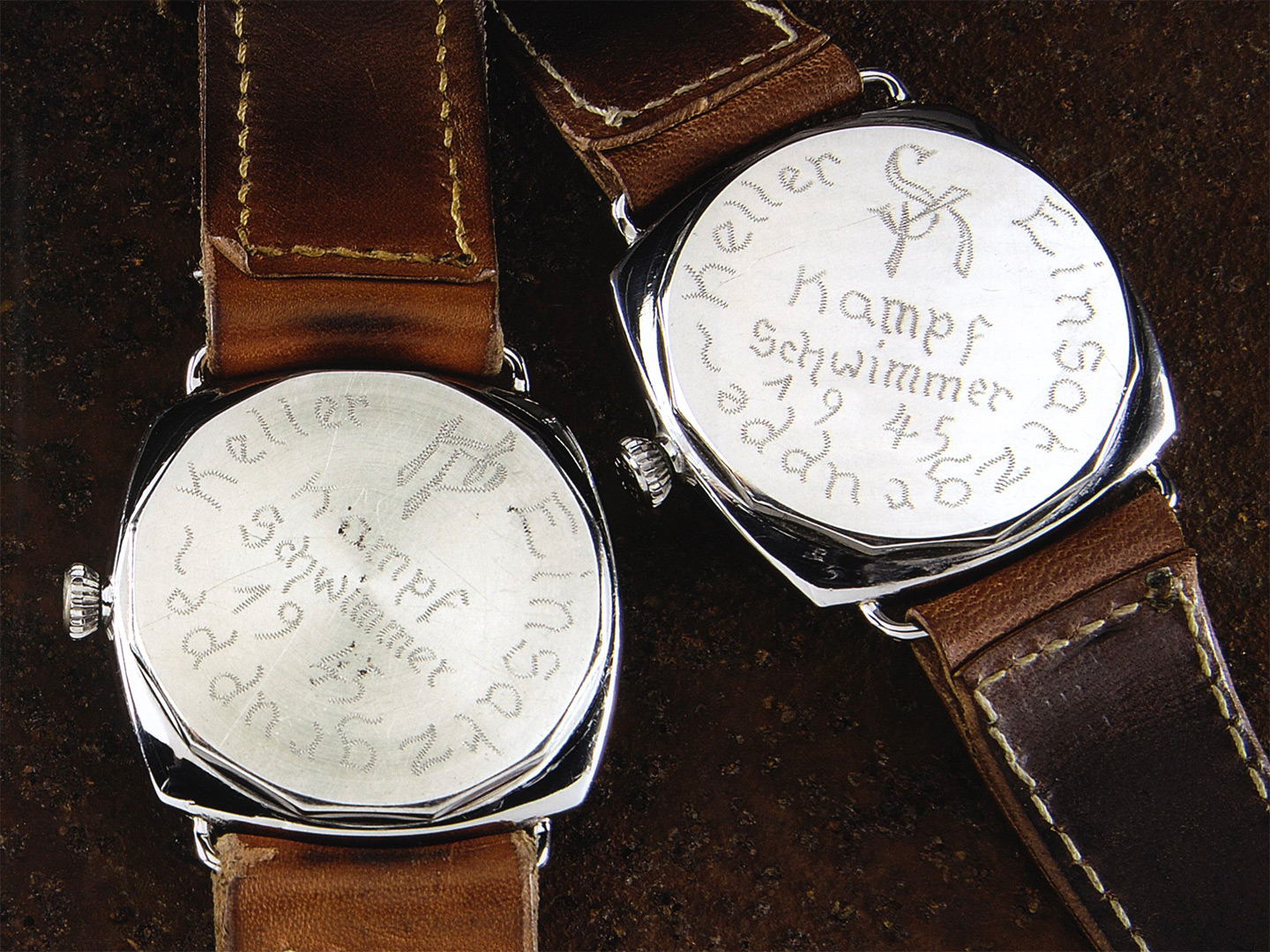 Some of these watches have distinctive engravings on their casebacks, leaving no doubt of their true provenance as Nazi Kampfschwimmer equipment. These engravings were made during the captivity of the German frogmen unit on the island of Sylt in northern Germany. The font is clearly inspired by the Fraktur, a font that was considered “Urdeutsch” (true German script) by the Nazis. Ironically, in January 1941 the Fraktur font was declared to be “Judenlettern” (Jewish letters) and prohibited.