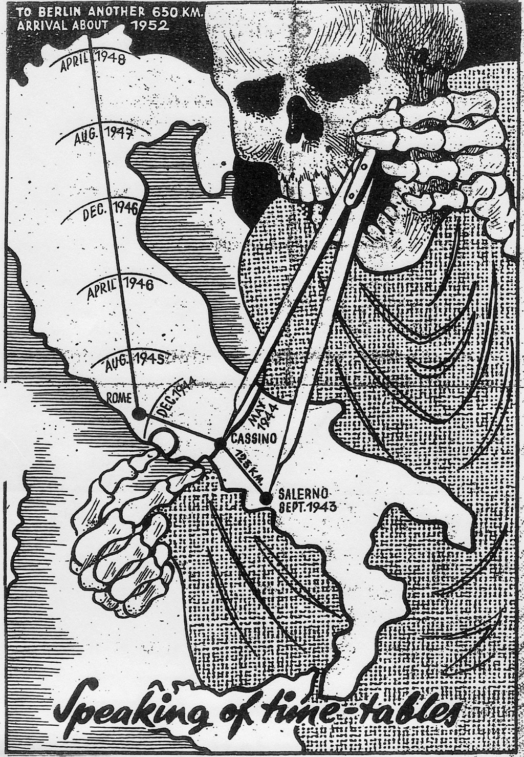 The Nazis mocked the Allied forces with propaganda leaflets depicting the slow pace of the Allied advance towards Rome and predicted their arrival in Berlin for 1952.