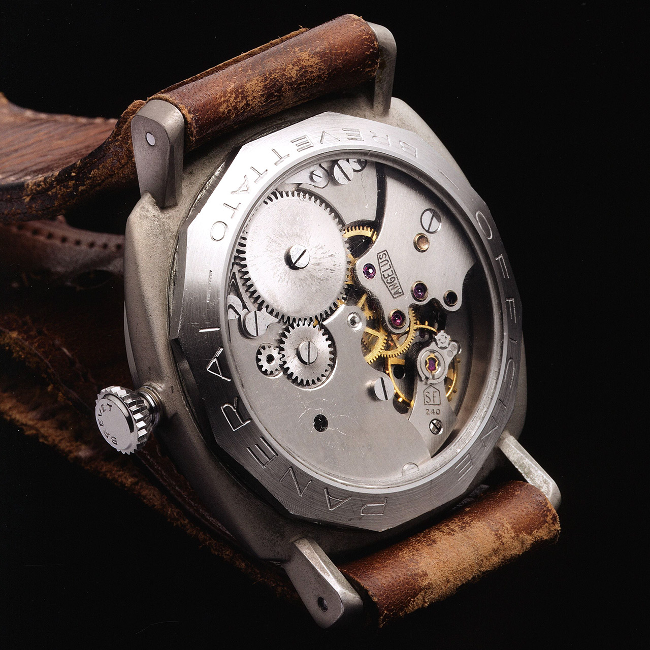 The Angelus caliber installed in this watch is from the very first Angelus 240 series produced on specific request of G. Panerai e Figlio. It is marked 12.55, just like the one in the Archivio Storico Panerai.