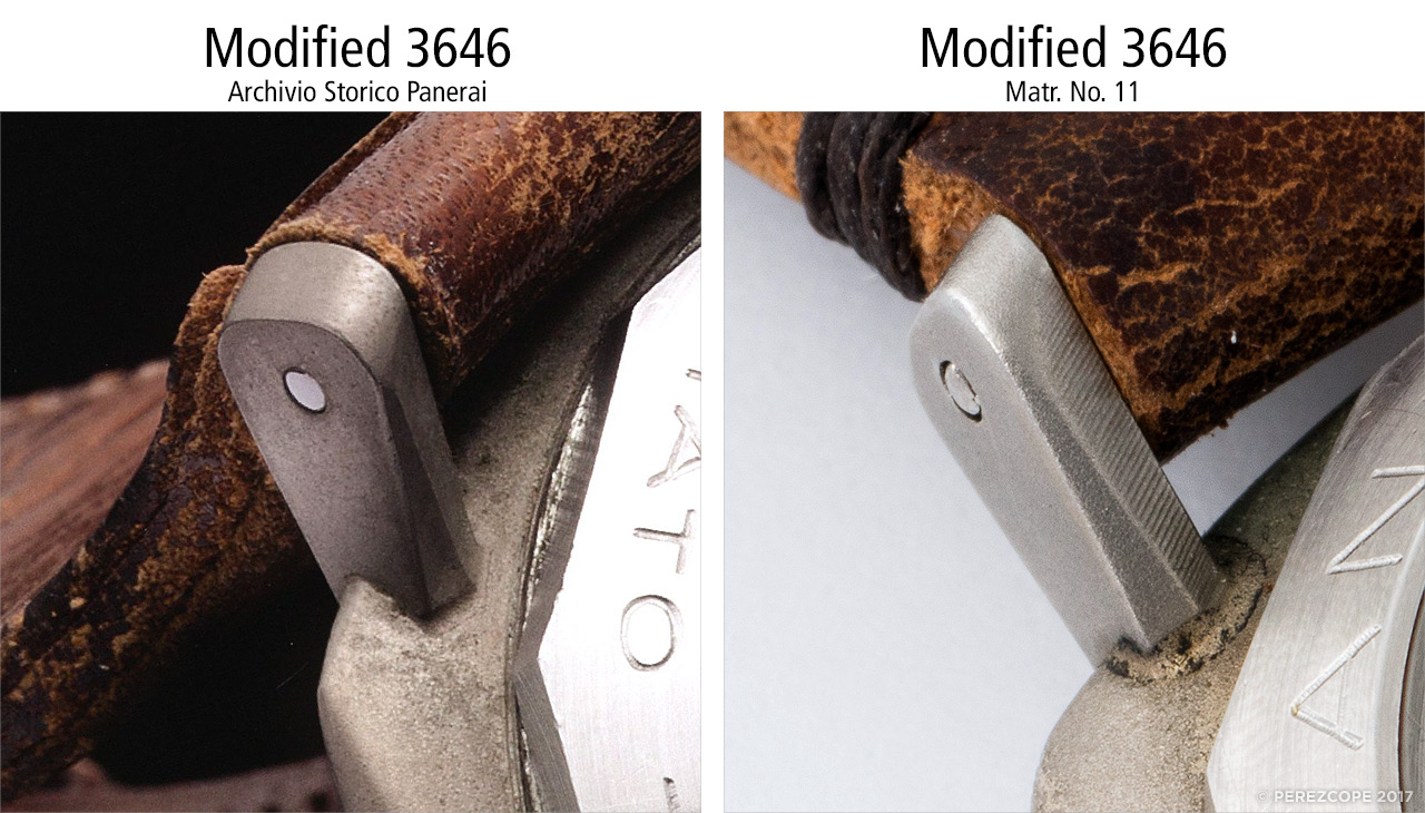 Let’s go back to the dial and compare Matr. No. 17 with the modified 3646 from the Archivio Storico Panerai. The engravings are clearly wider and much bolder on Matr. No. 17. There are other discrepancies too, the number 6 is more open on Matr. No. 17 and the number 3 has a different shape.