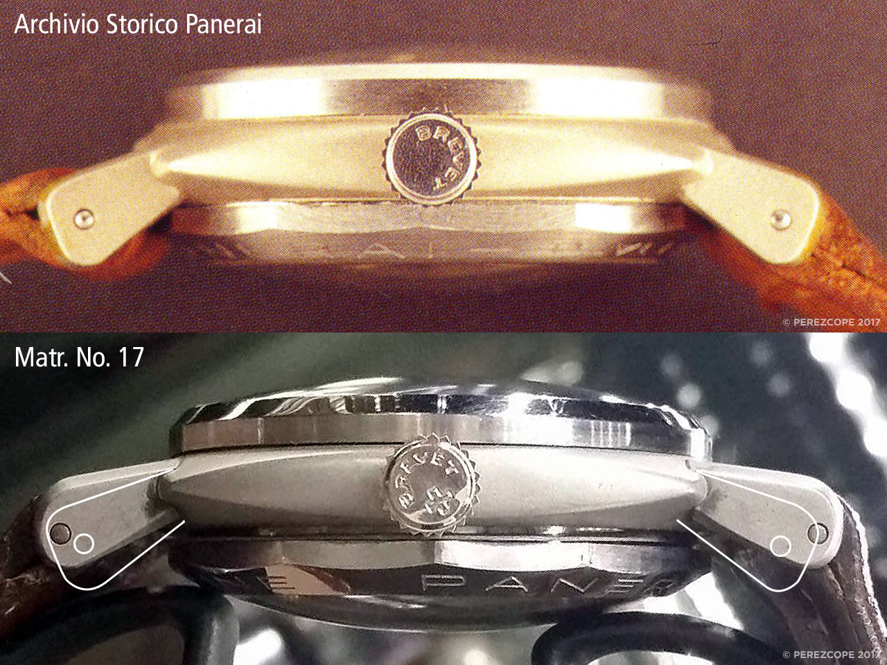 Let’s have a look at the case profile and compare it to the watch from the Archivio Storico Panerai. On Matr. No. 17, the lugs are welded in a much flatter angle. The shape of the lugs is different too and they are longer. All previous models are consistent. Another thing that does match is the bezel. The first three watches have an undisputable provenance and they look almost identical. Matr. No. 17 clearly stands out.