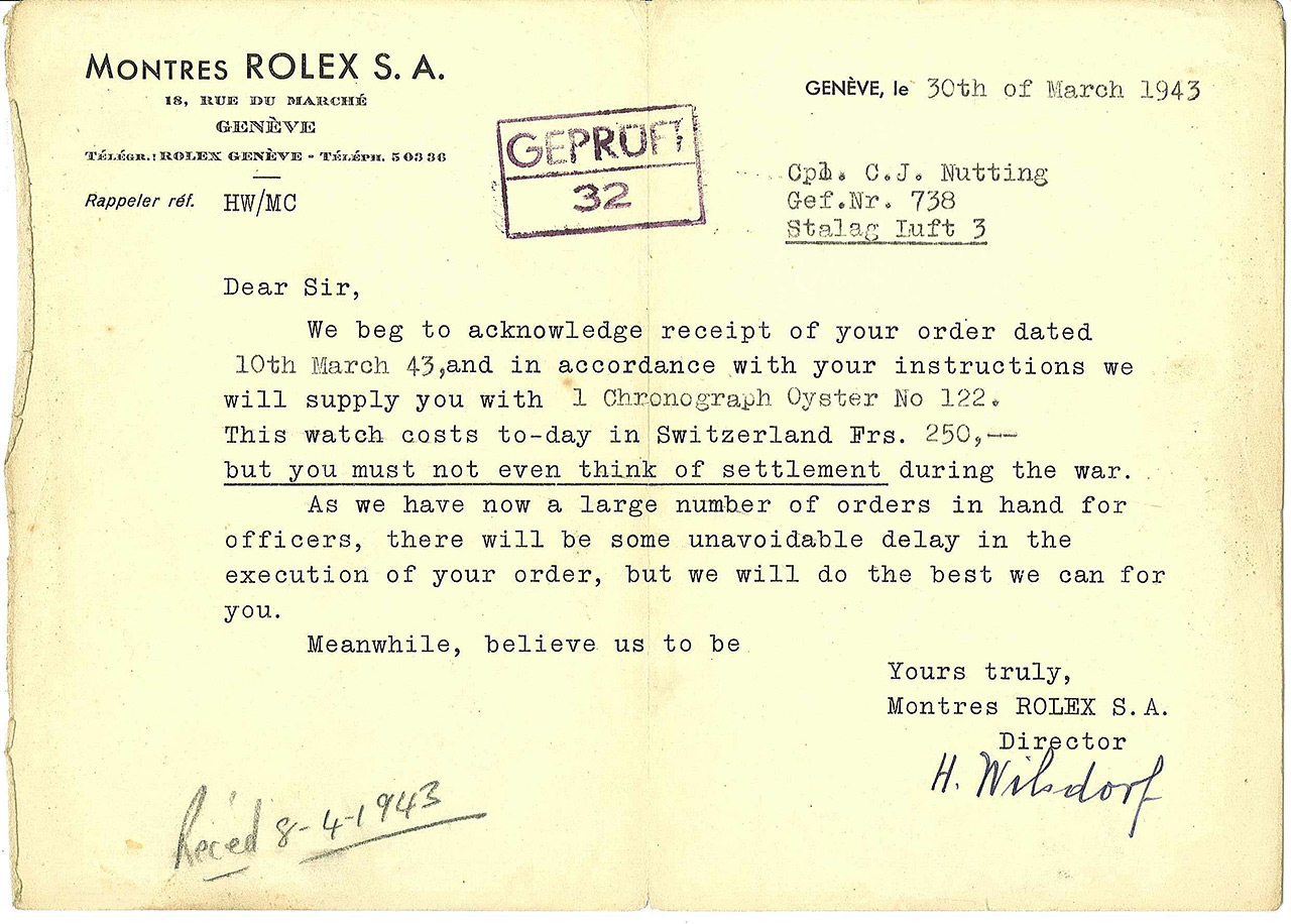 The very next day, two of Giuseppe’s employees were rounded up by German troops and arrested under false claims of collaborating with Italian Partisans. Giuseppe rushed to the local German command to vouch for his employees and make clear that without them it would be impossible to meet Schomburg’s tight dealine. They were released after a few days, but this episode showed Giuseppe how serious the situation had become and what was at stake. Giuseppe contacted Rolex in Geneva and placed the order via telegram.