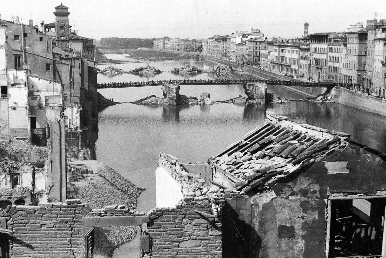 The next morning, the Germans in the South of Florence were gone and with them all historical bridges over the river Arno. All bridges, except for the Ponte Vecchio, had been destroyed.