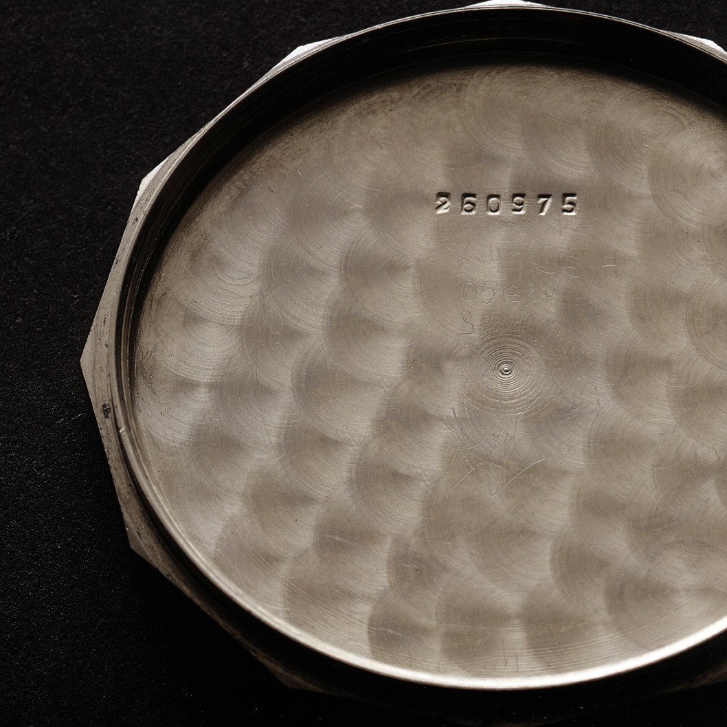 The caseback is completely anonymous. Before shipping the watches to Florence in 1944, Rolex’s casemaker C. R. Spillmann removed all hallmarks which could identify Rolex as the maker. The case numbers were restamped at a different position.