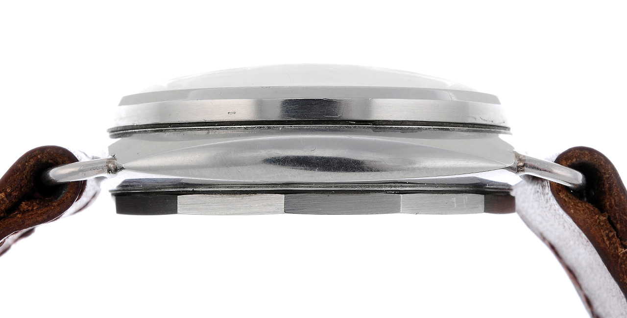 This watch comes also with a beautiful and original nickel-plated “knife edge” brass buckle. The plating is a bit worn and the brass can be seen quite well. The buckle was bent in oder to be more ergonomic. The strap is new.