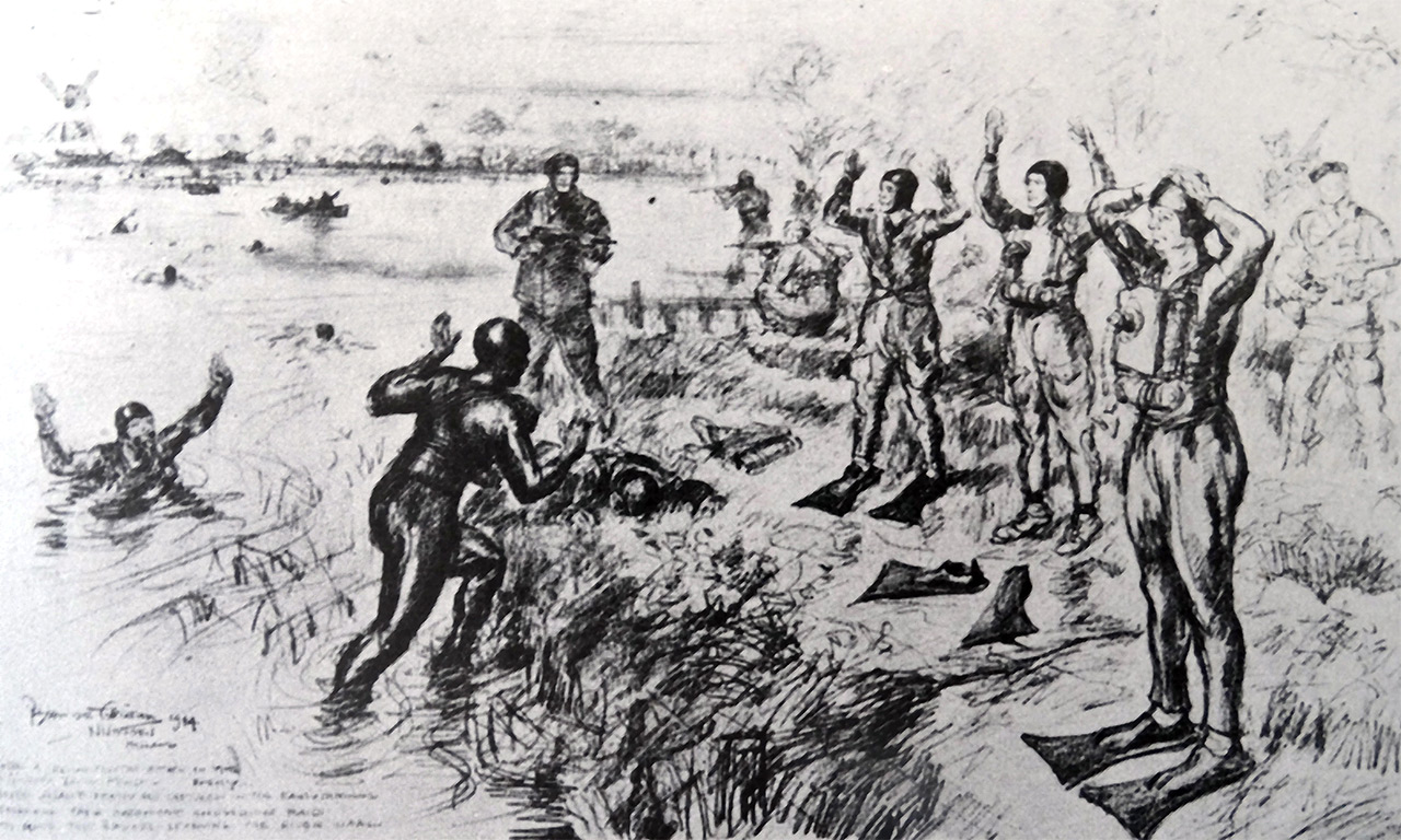 Totally exhausted, the Kampfschwimmers reached the banks of the river, where they were captured by the Allies. The following drawing illustrates how the Kampfschwimmers were captured. George H. Rowson, the owner of this watch, was part of the British group that captured the Kampfschwimmers.