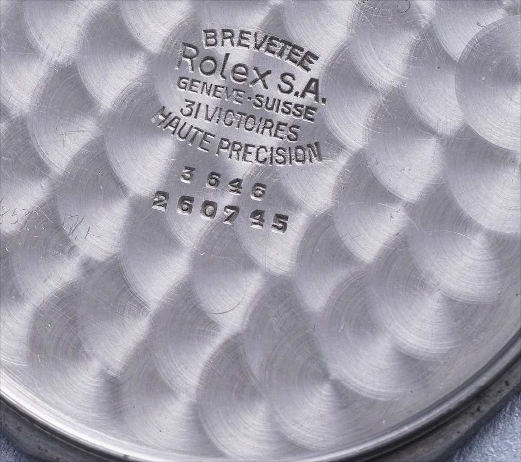 The dodecagonal screw caseback with crisp perlage finish and typical 1940s Rolex hallmarks. The original lead gasket is included.