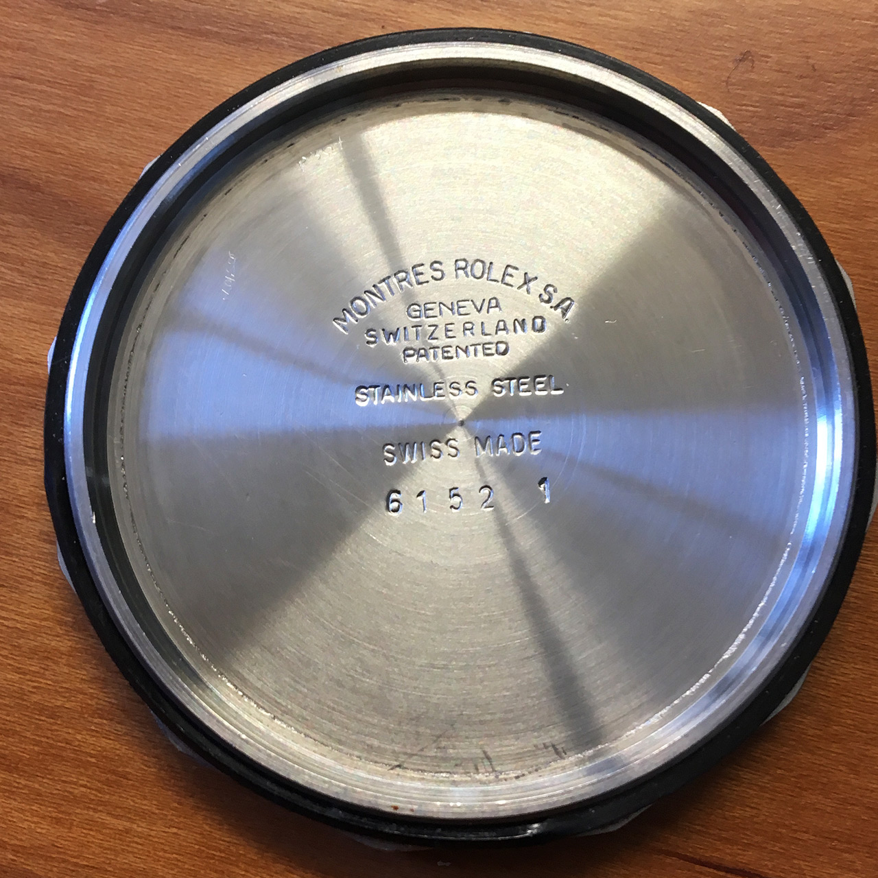 The inside of the caseback shows the typical Rolex hallmarks.