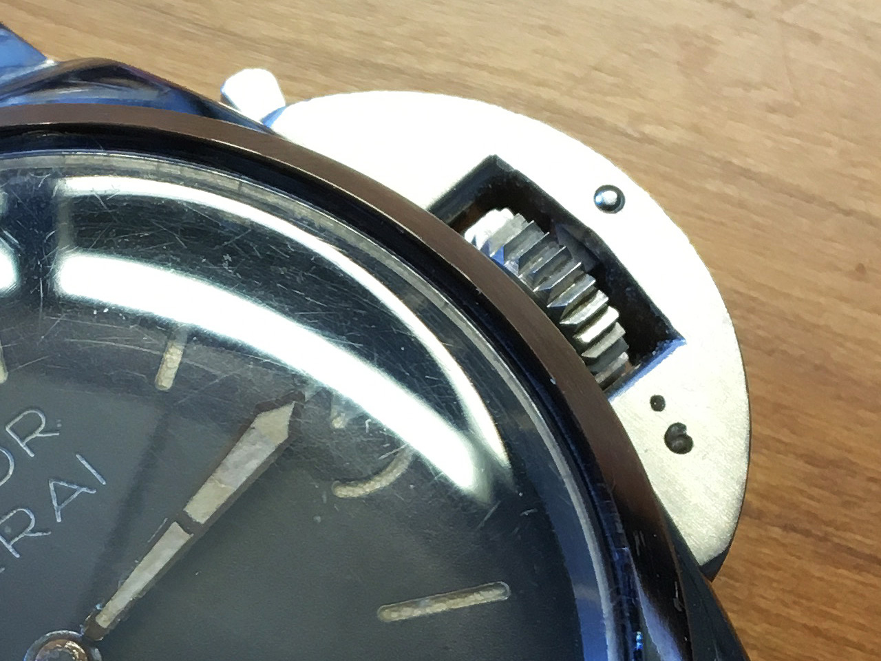 The dial of this watch is an original LUMINOR PANERAI dial from the 1960s. The engravings are thin and precise. G. Panerai e Figlio was a precision workshop after all and everything that left the premises had to be perfect. The lume appears to have slightly crackled underneath the transparent fillings of the numerals and hour markers.