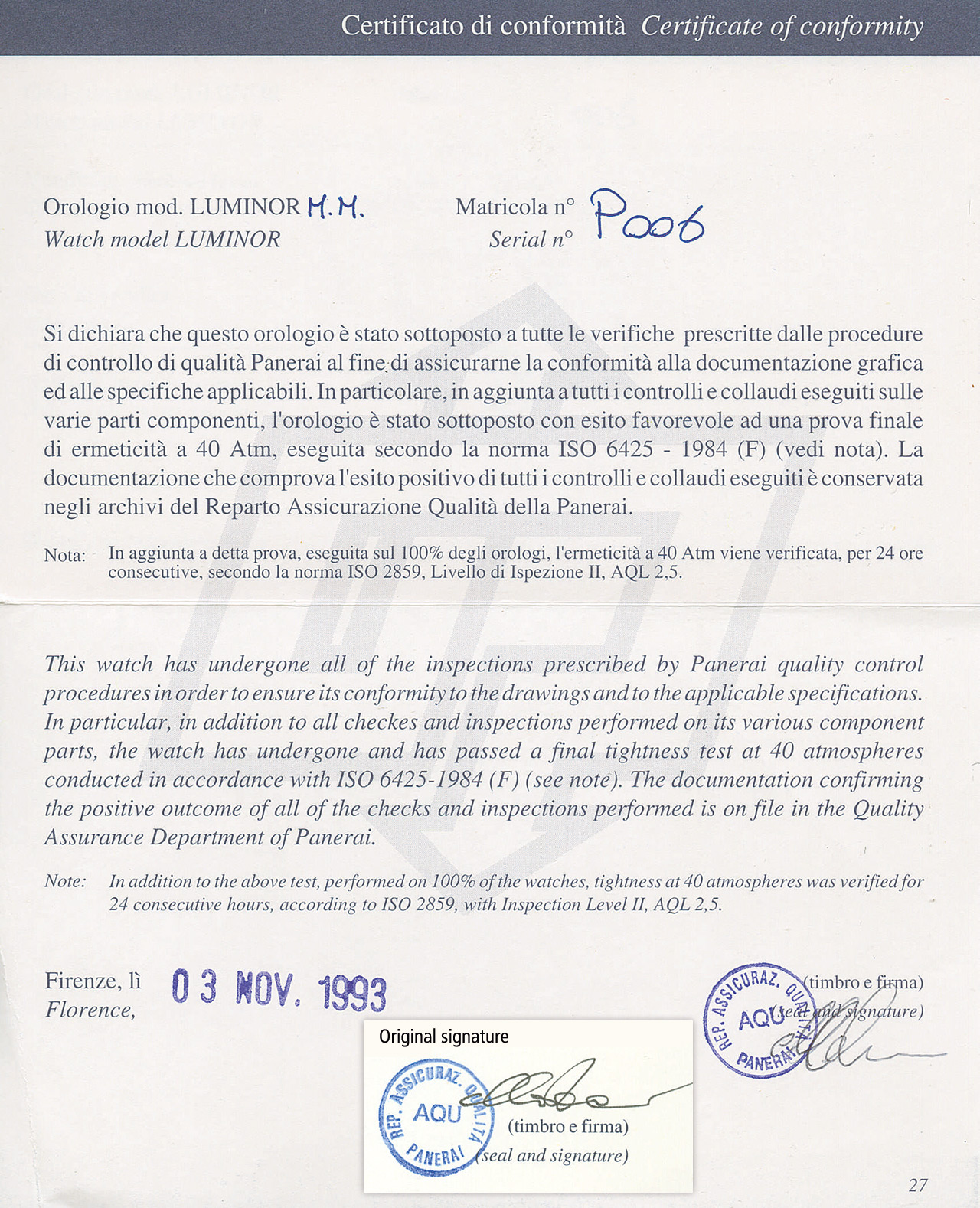 This watch is accompanied by a Panerai Registration and Service Booklet. The Certificate of conformity has the typical Paneria QC stamp and appears at first glance to be signed by Mario Paci. However, Mario Paci’s signature looks wrong so I double checked with him and he confirmed that this signature is fake. In addition, Mr. Paci used to sign above the label: seal and signature, never underneath.