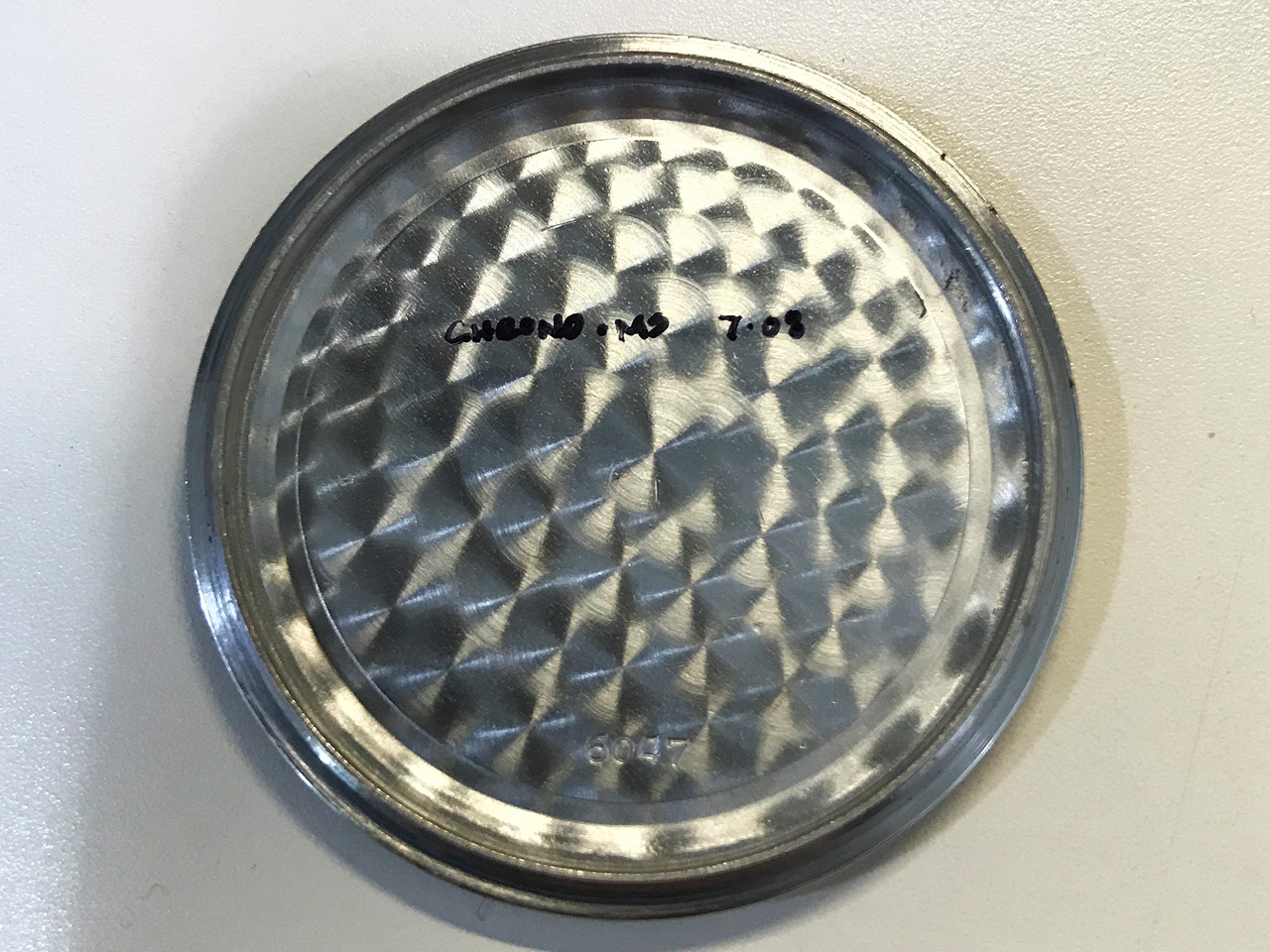 The inside of this caseback has the typical Perlage finish but bears no Guenat reference number. Only the earliest preproduction casebacks had no Guenat hallmark on the inside. In addition, the inner shape is off compared to genuine Guenat casebacks.