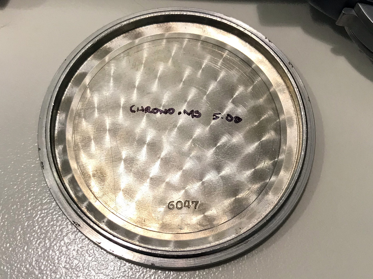 However, the real magic of preproduction units is only visible after opening the watch. P006 has the internal Guenat reference number 6047 stamped on the inside of the caseback and this important detail simply doesn’t add up with preproduction units. This caseback could be original though, as I came across the information that for some reasons unnumbered casebacks were indeed available.