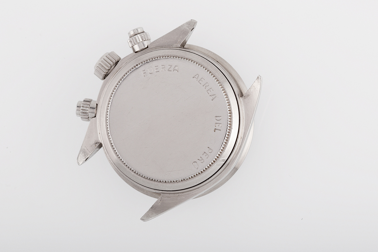 The caseback of this watch with typical “Fuerza Aerea del Peru” engravings on the outside of the caseback.