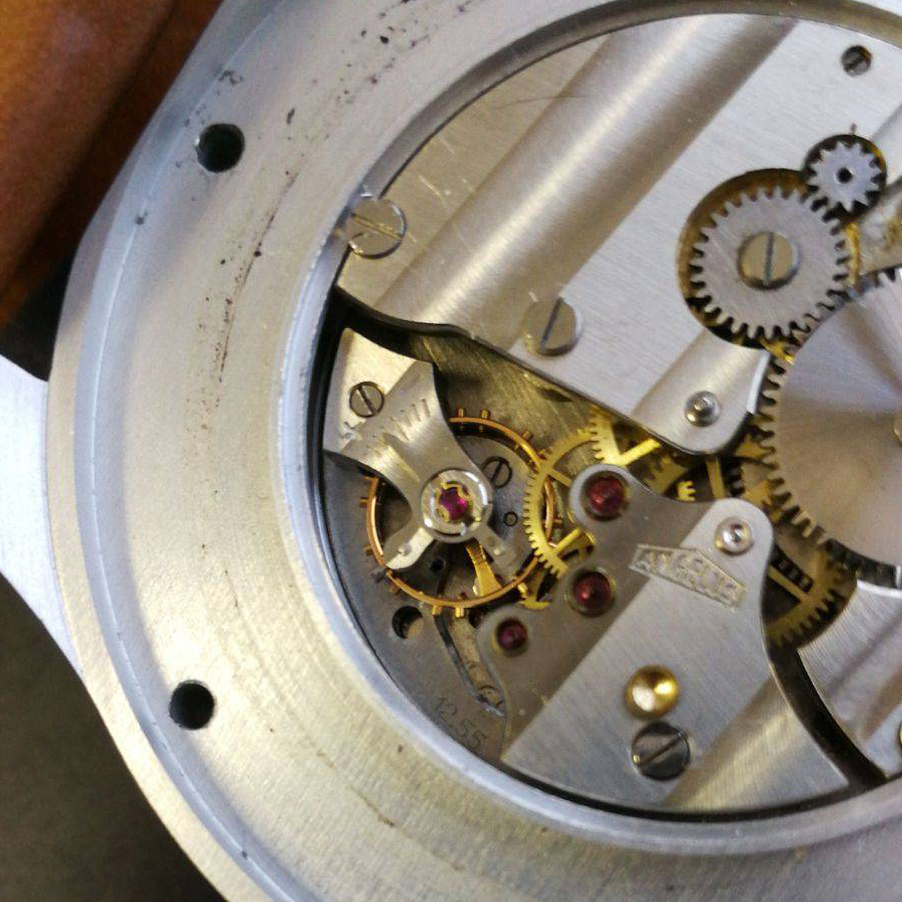 The next picture shows the original movement of Matr. N.E. 007. The most obvious difference is of course the shape of the barrel bridge, but there is more. The bridge finish for instance. 12.55 stamped movements had a brushed finish on the bridges, while movements from late 1956 onwards were adorned with wide Côtes de Genève.
