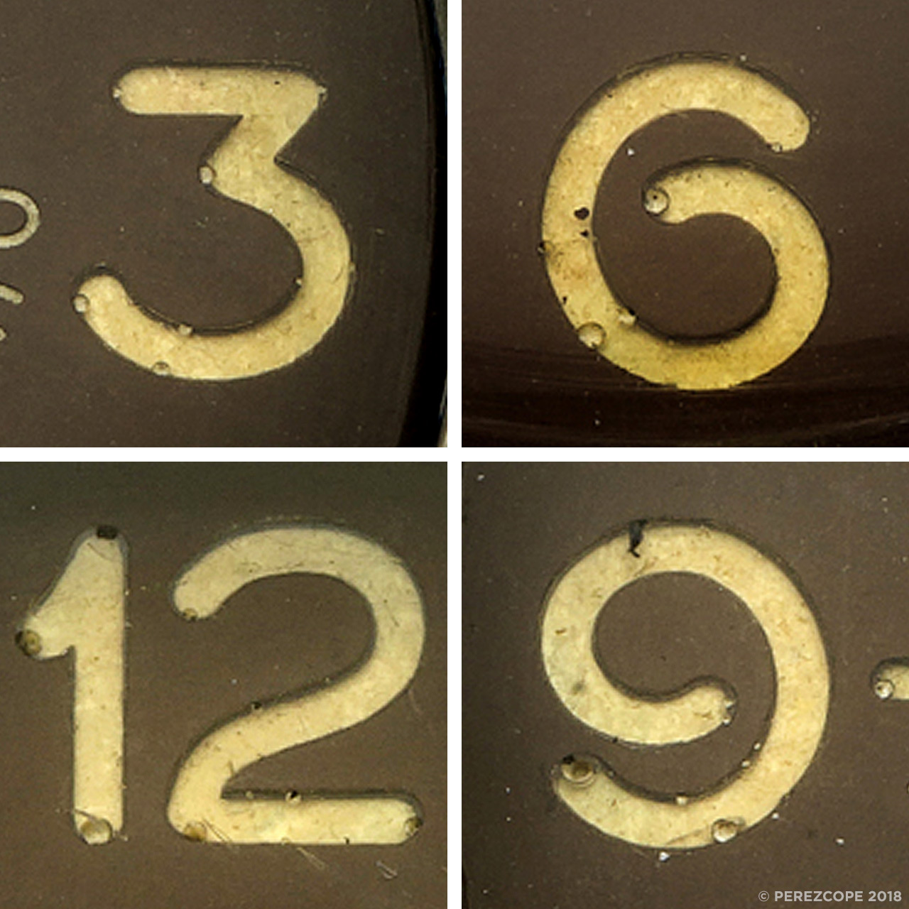 Aside from all numerals having incorrect shapes, the transparent filling of the numerals also bears strange air inclusions or bubbles, something that does not occur on regular dials.