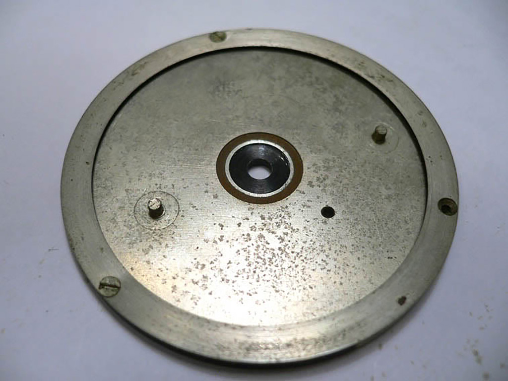The next picture shows the back of the original dial found in Matr. N.E. 035. Note the outer ring. This seems to be some kind of spring, installed to prevent the movement from being screwed too tight. Angelus 240 movement are extremely sensitive to vertical pressure due to their pillar construction. On original dials, these spacer rings have a different colour than on the dial that is attached to the movement above. Original spacer rings were probably made of spring steel whereas the spacer ring on the fake dial is obviously made of brass, a material that lacks the necessary elastic behaviour, and has probably no function other than to mimik the original look.