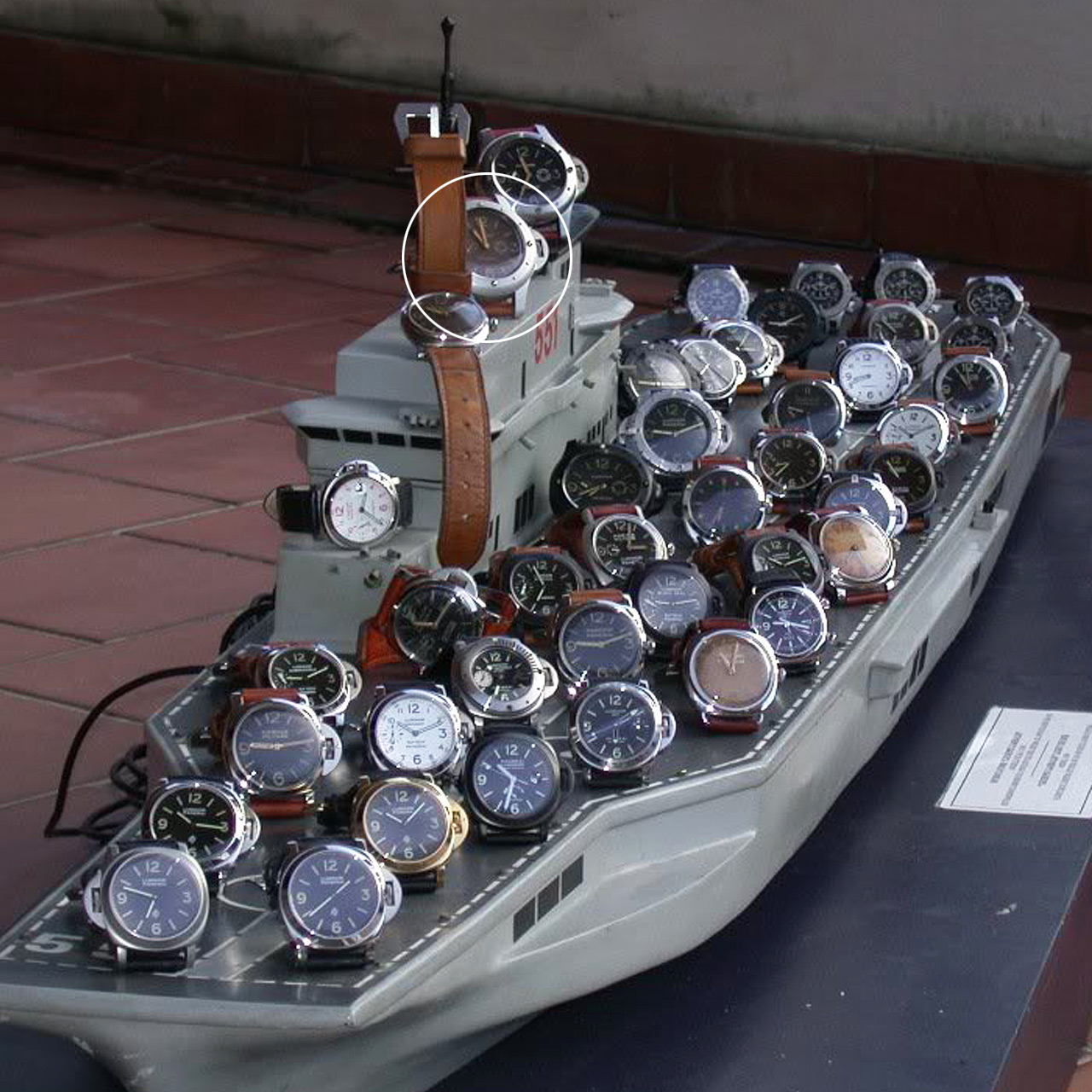 The next picture show the so-called “Ship of Fools”. This picture appeared on Panerai forums in the mid 2000s and shows the complete Panerai collection of Luciano Rinaldi. Old school Paneristi remember well how much discussions and trouble this picture caused. Most watches on this miniature model of the Garibaldi aircraft carrier are made-up or fakes. The GPF 2/56 in question is clearly visible aboard this ship (circle). Can you spot Matr. No. 17 as well?