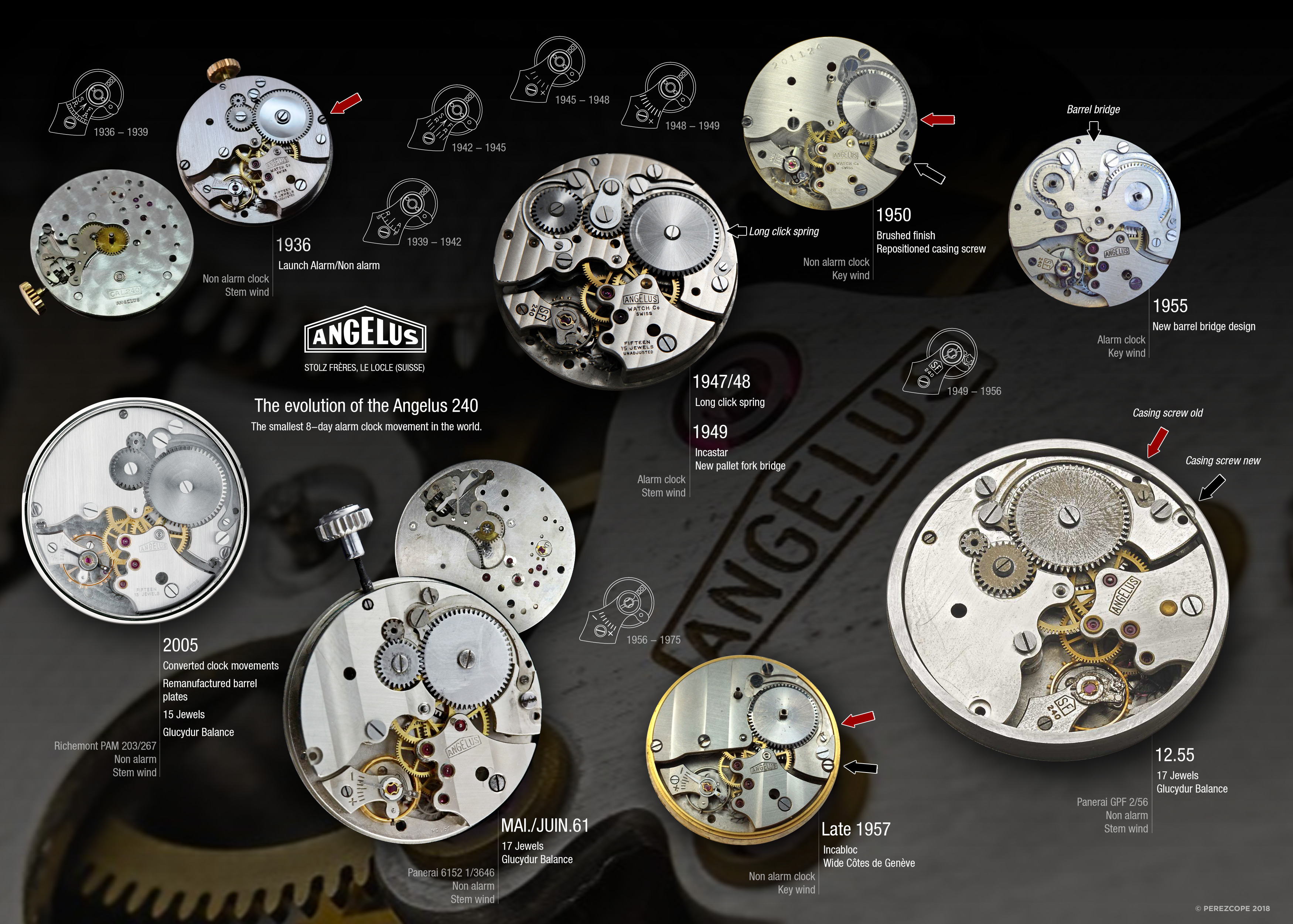 To understand what makes this movement a converted key-winding table clock unit we need to look into the evolution of Angelus 240 movements. Please click the following infographic to download the highres version.