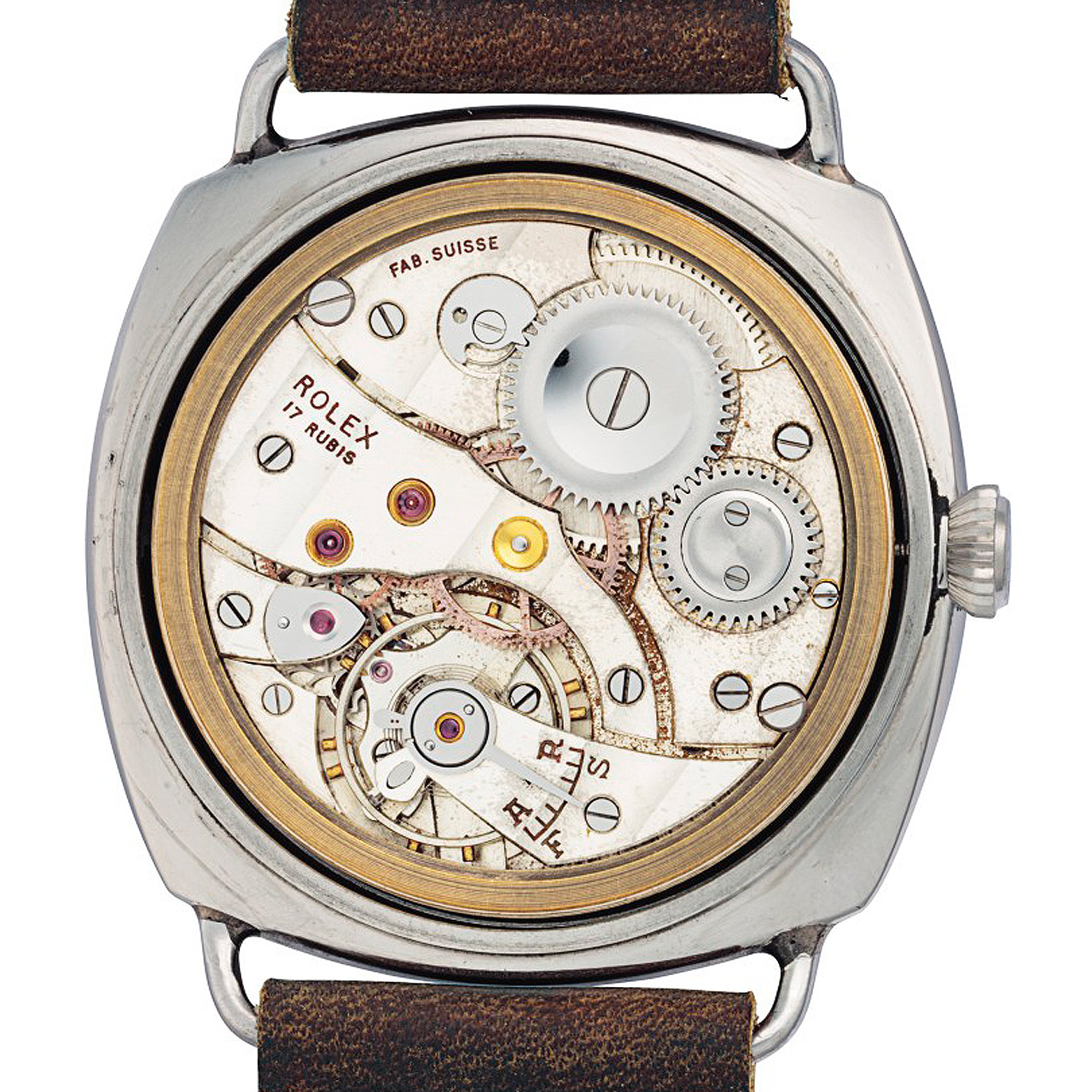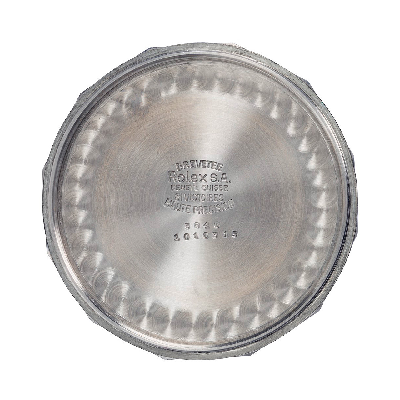 The dodecagonal (12-sided) caseback bears the typical Rolex hallmarks on the inside. Case number 1010315 with its seven digits is a typical Rolex pocket watch number. The first three types of Ref. 3646 (Type A, B & C) were produced within the pocket watch range. Later batches had Oyster case numbers.