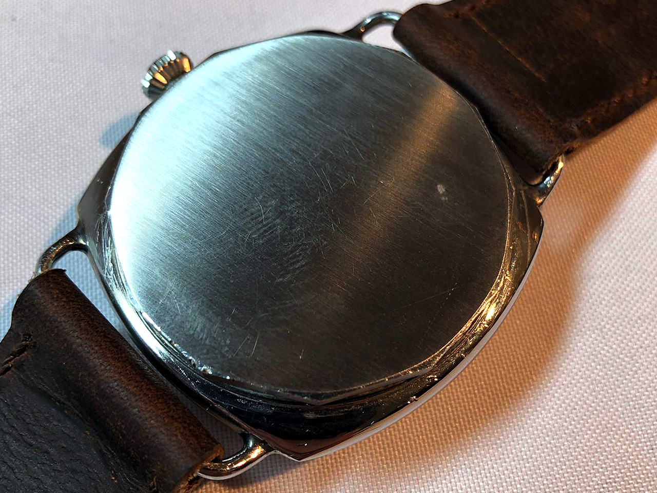 The earliest watches were equipped with so-called “plastic rivet” dials which were prone to extreme warping after exposure to heat. The following picture shows such a damaged early Panerai dial.