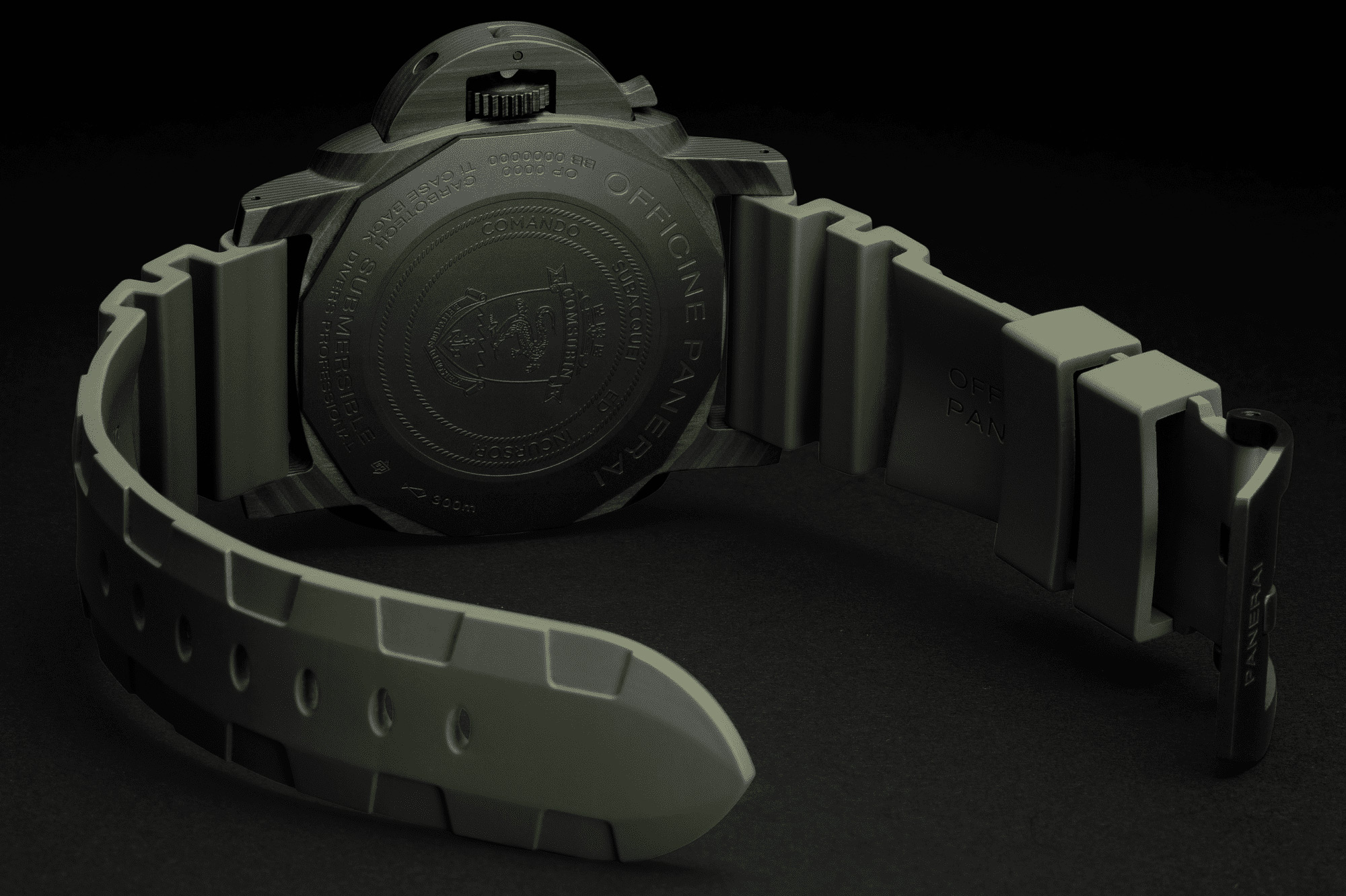 The case of the PAM00961 is made of Carbotech, a composit material based on carbon fibre. Thanks to this material, the watch weighs almost nothing. In addition, the carbon gives the watch a camouflage look that gels very well with the military theme.