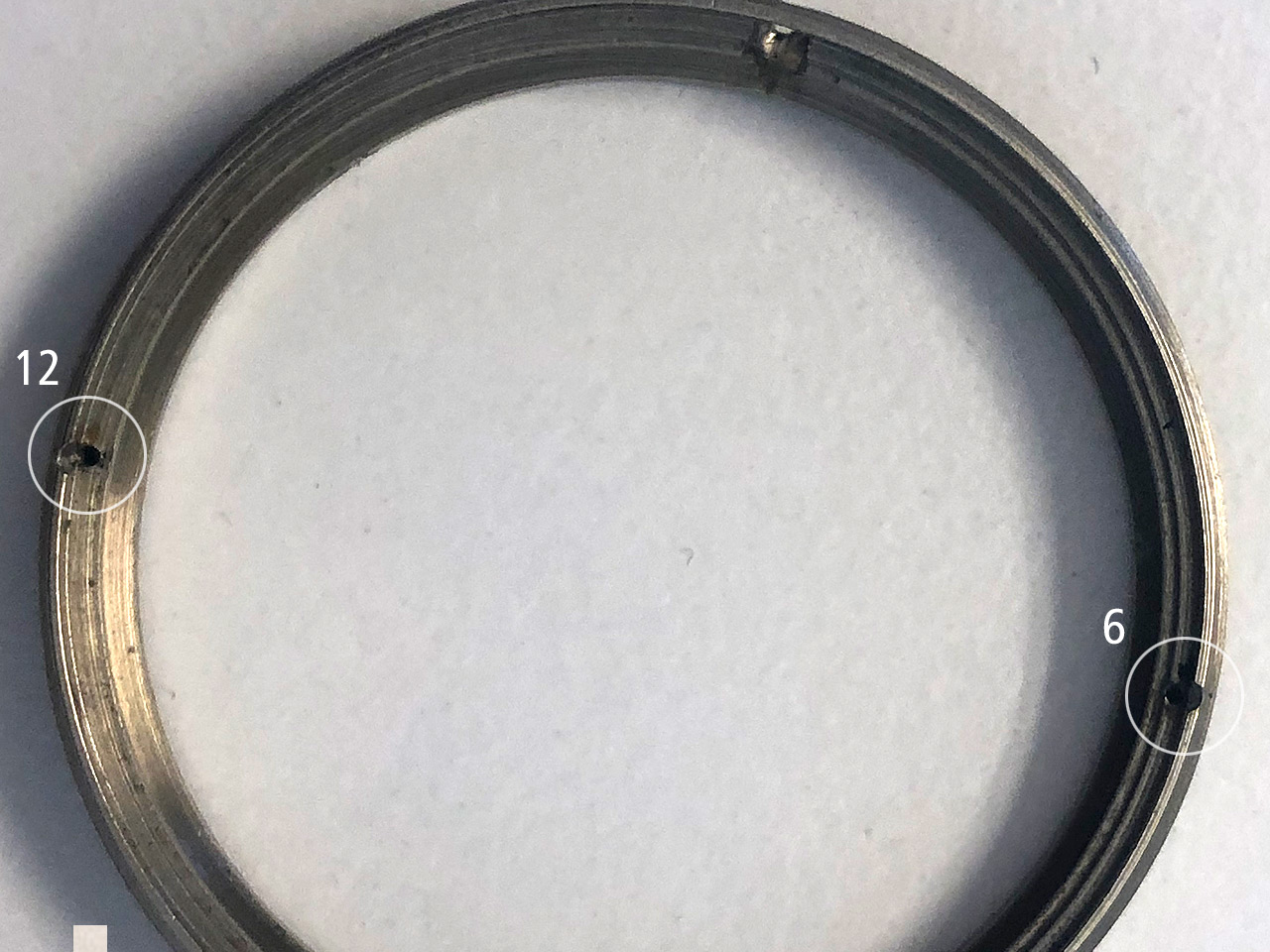 Sotheby’s had the watch dissasemled for proper inspection. The next image shows the movement retaining ring on its own. As you can see, there are holes at 6  and 12 o’clock.