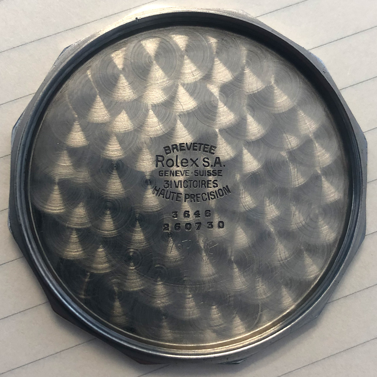 The inside of the caseback bears typical Rolex caseback stamps which appeared on most Rolex Oyster watches produced between 1938 and 1945. The case number 260730 is a Rolex Oyster case number from 1943/44.