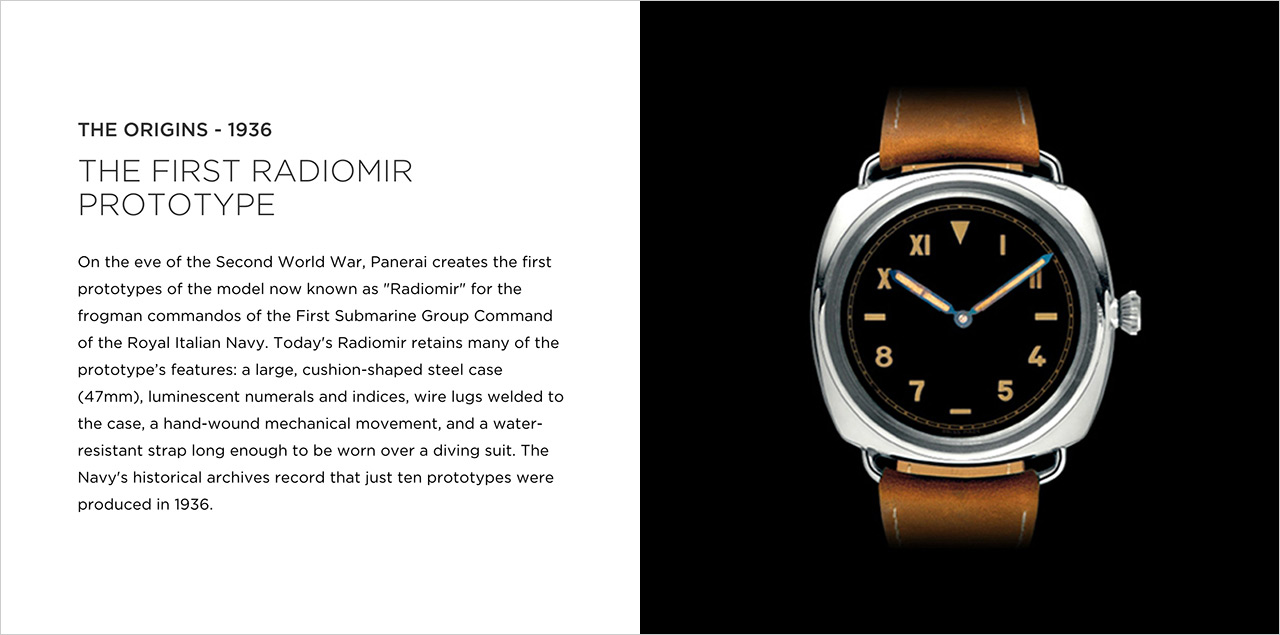 The modern Panerai company owned by Richemont uses suggestive language to make-believe Panerai itself created this dial in 1936. The following screenshot was taken from the history section of the Panerai website.