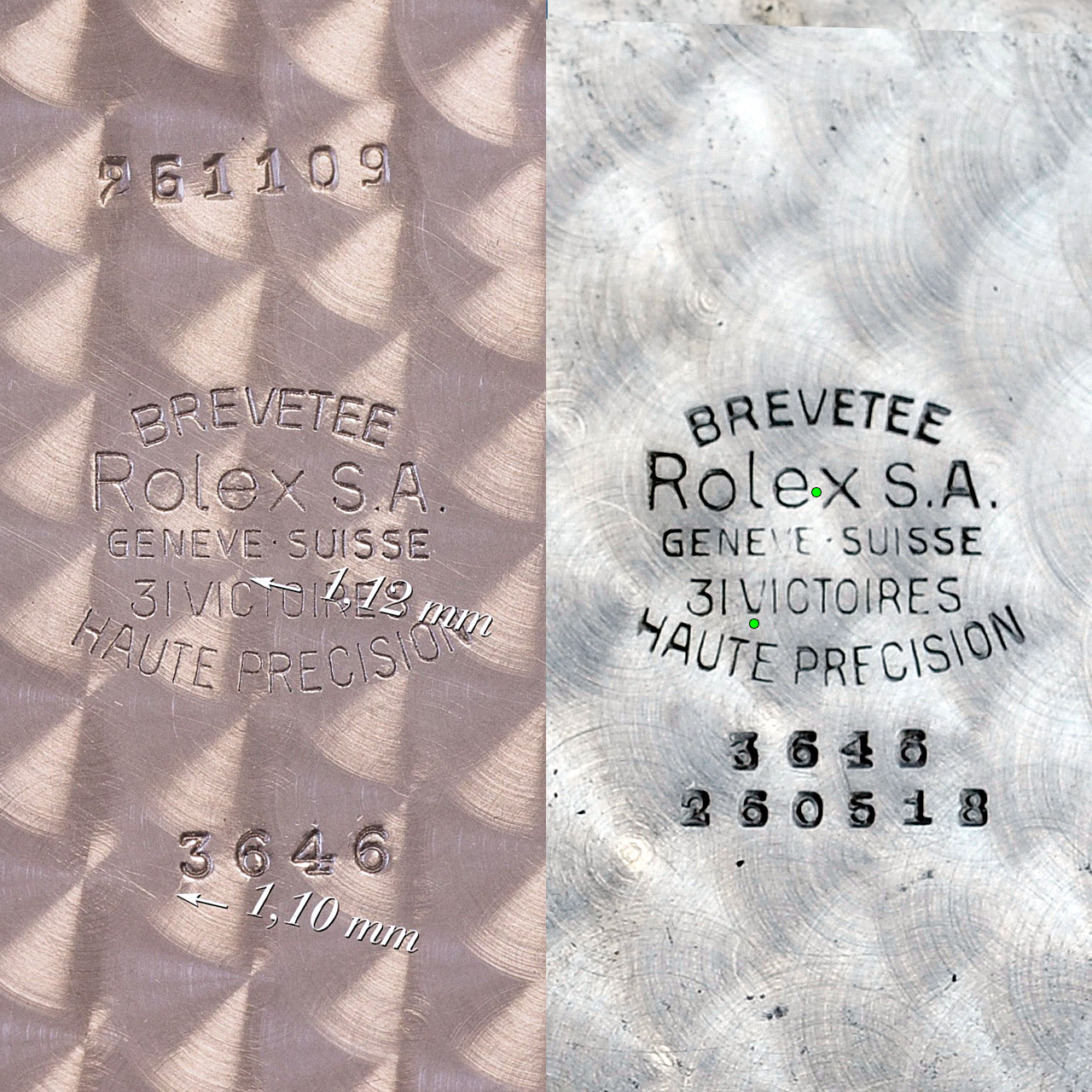 A closer look at the stamps of 261109 (Type F) reveal similar issues as the present watch. Again, the e in Rolex has a wrong shape and the flat bottom of the V in Victoires is not as pronounced as on the original stamp.