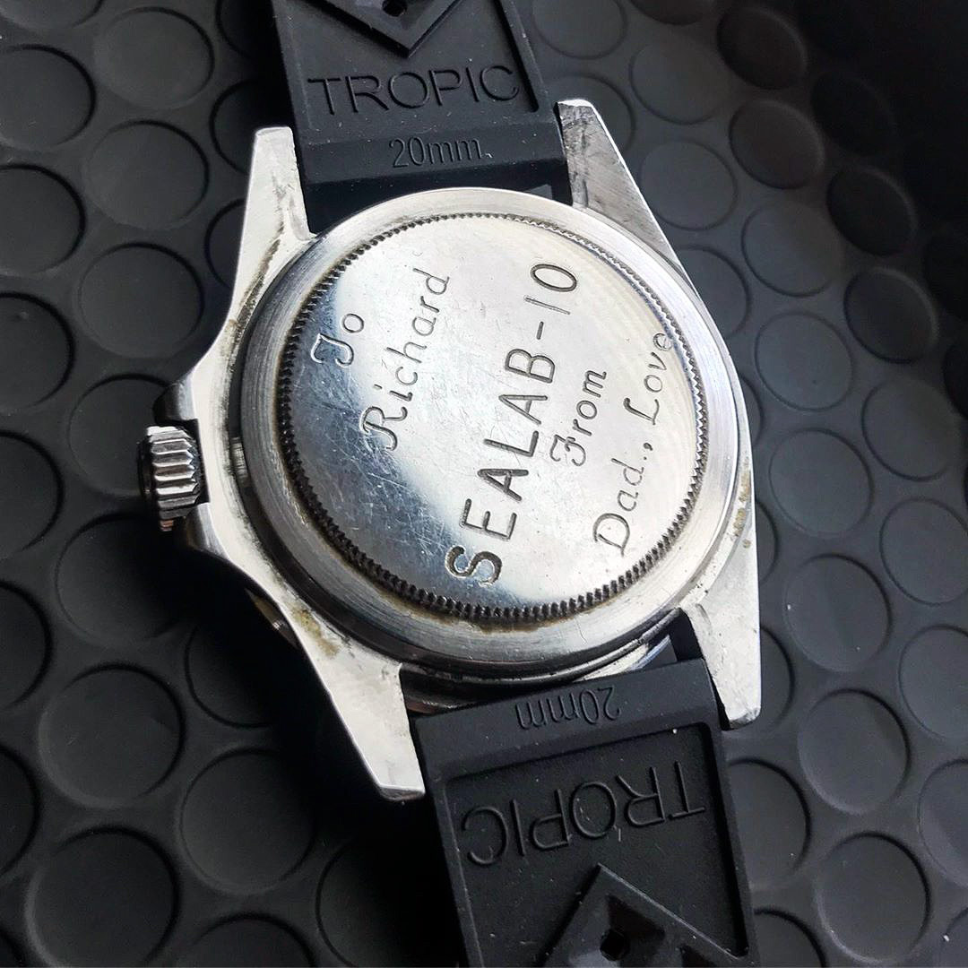In addition to the SEALAB – 10 engravings, the present watch also bears a personal dedication from a father to his son: To Richard From Dad. Love. It is unknown who dad is/was.