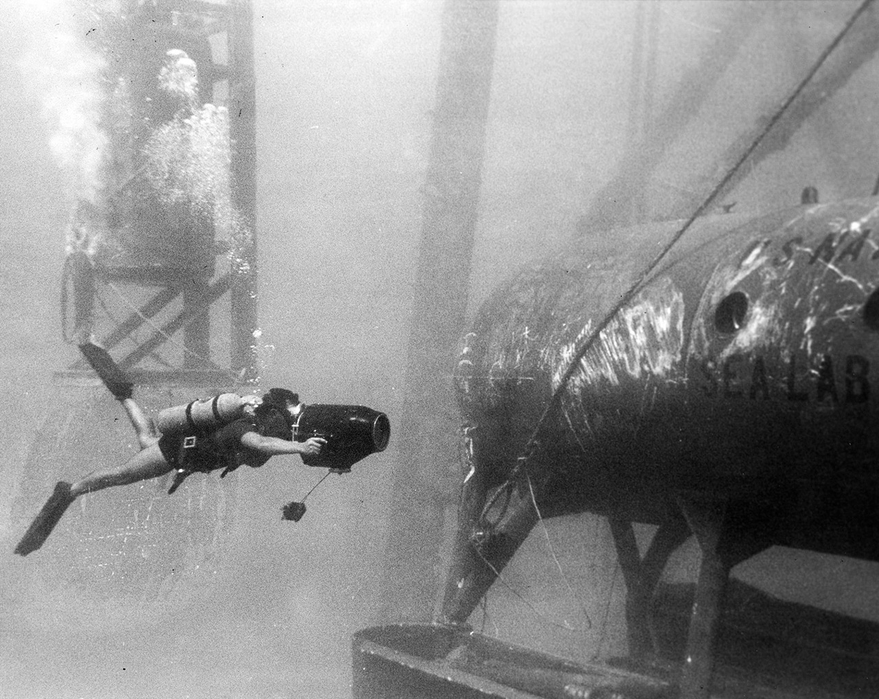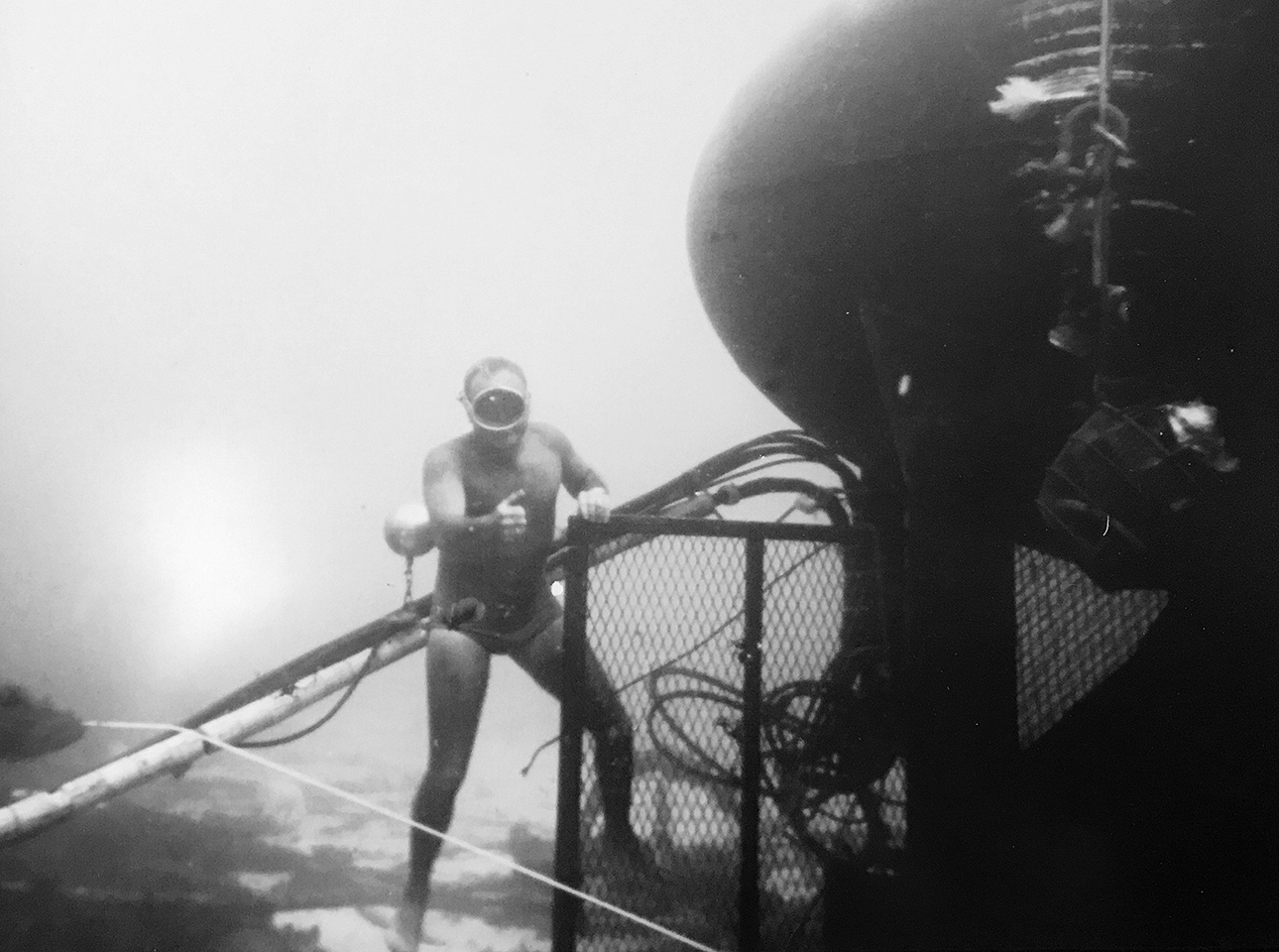 Since the inside pressure of the habitat had been equalized with the outside water pressure, the Aquanauts could go in and out as they pleased through an open hatch at the bottom. Bob Barth left the habitat often just by holding his breath.