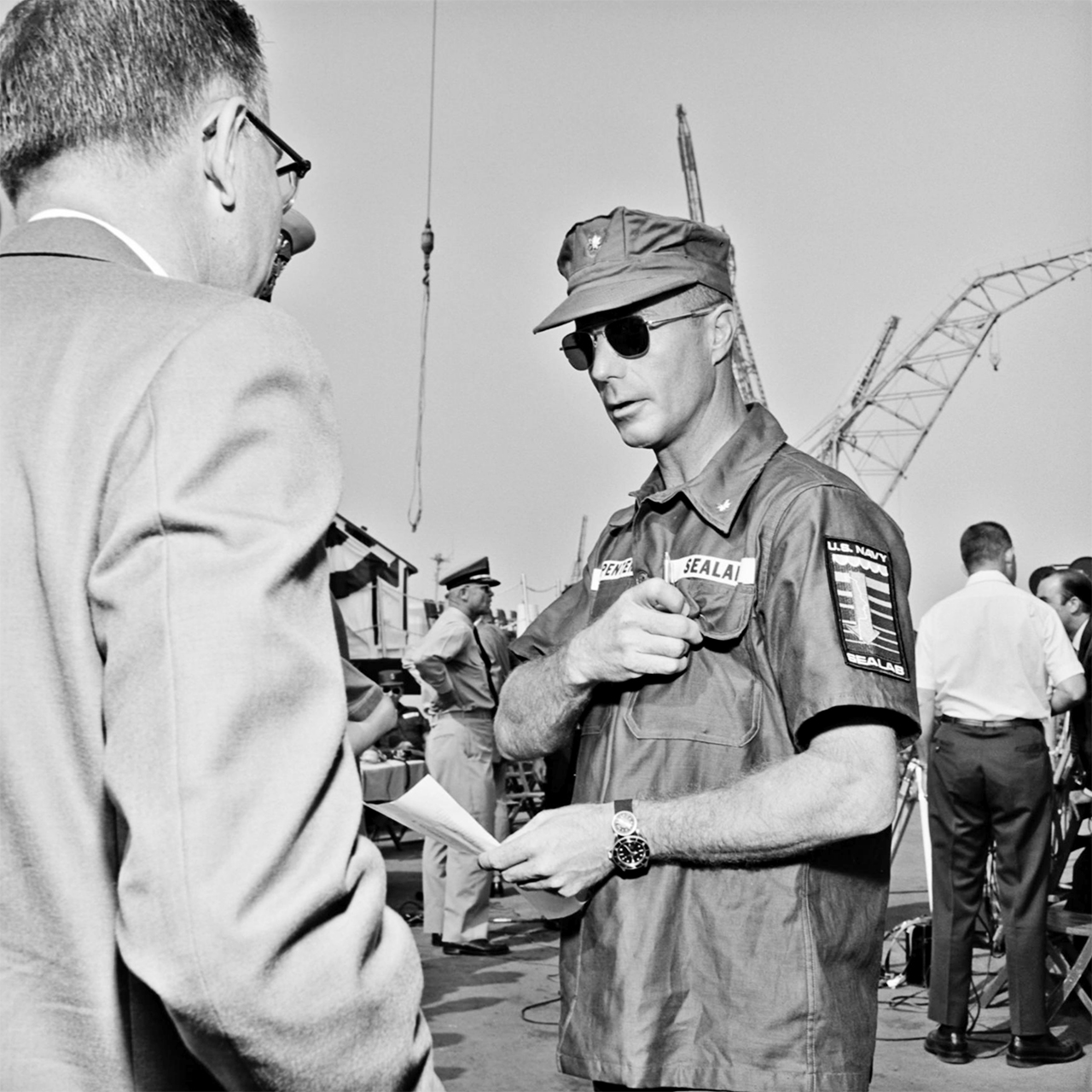 The picture below shows Earl Murray from the Scripps Institution of Oceanography discussing tasks with U.S. Navy diver Cyril Tuckfield. The latter is clearly wearing a Rolex Submariner.