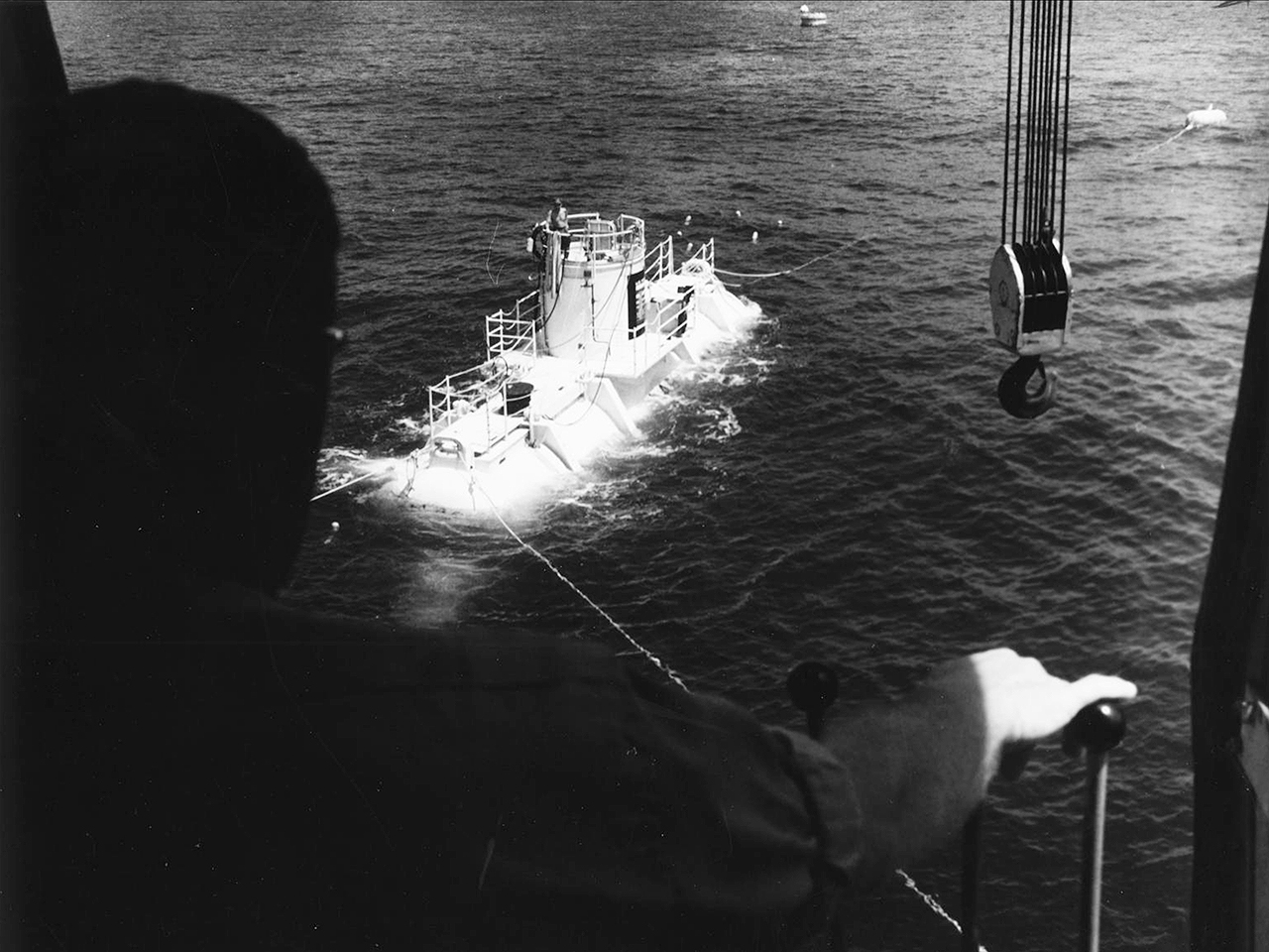 Prior to completion of Team One’s mission, some members of Team Two decended to the habitat to exchange data and bring each other up to speed. Subsequently Team One – minus Scott Carpenter who stayed underwater as leader of Team Two for another 15 days (30 days in total) – left the habitat and transferred via Personnel Transfer Capsule (PTC) to the Diving Decompression Chamber (DDC) aboard the diving support vessel for two full days of decompression.