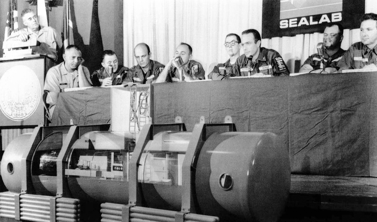 The picture below was taken during a news conference on September 28, 1965 at the end of Scott Carpenter’s record saturation dive of 30 days.