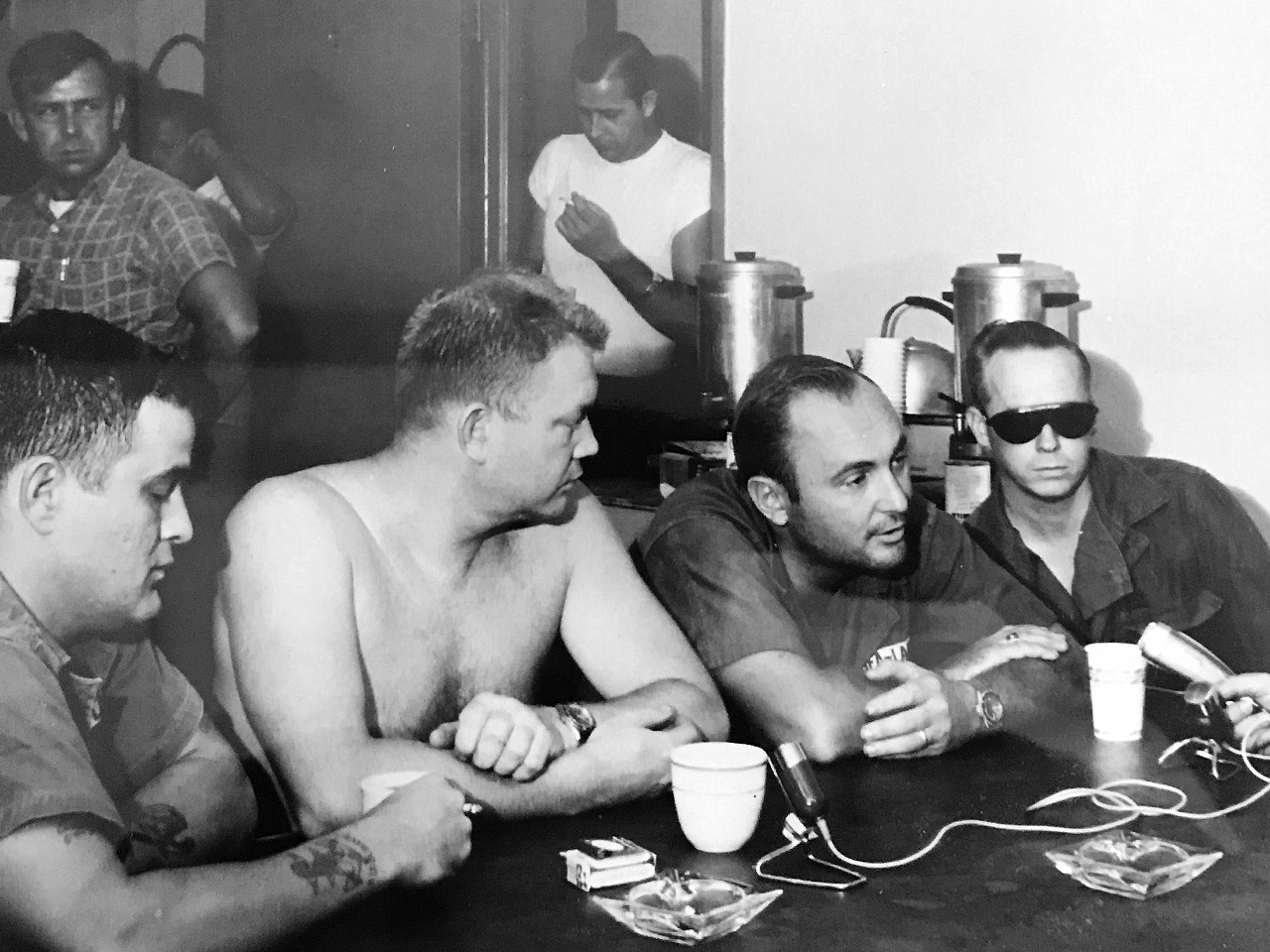 After successful decompression, the four Aquanauts were greated by numerous cameras and reporters. A new chapter in diving history had been written. The photo below shows the Aquanauts during the following press conference on Argus. Robert Thompson and Bob Barth in the center are both seen wearing Rolex Submariners.