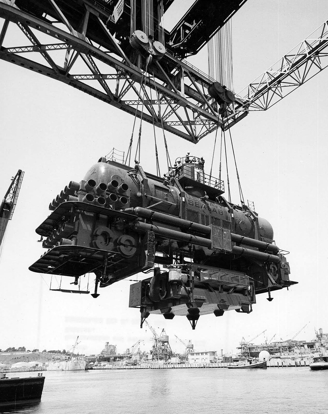 After completion at the San Fransisco Naval Shipyard, SEALAB 2 was barged to the Long Beach Naval Yard for final outfitting and christening ceremony.